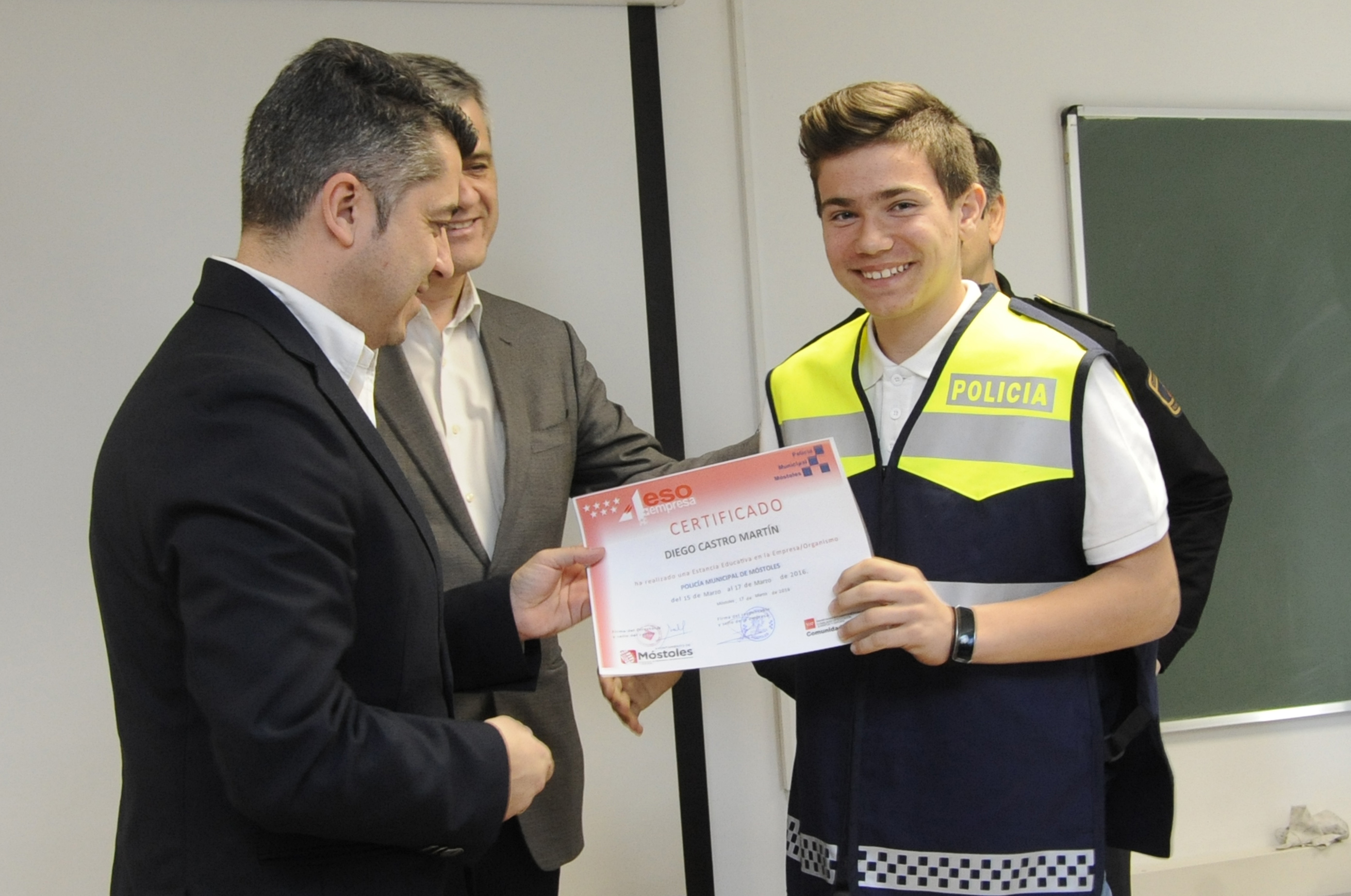 Entrega diplomas Policia Municipal 00Imagen en alta resolución. Este enlace se abrirá mediante lightbox, puede haber un cambio de contextoEntrega diplomas Policia Municipal 00Una nueva edición del programa de estancia educativa `4º ESO + Empresa´ de la Dirección General de Educación Secundaria, Formación Profesional y Enseñanzas de Régimen Especial de la Comunidad de Madrid se ha celebrado en Móstoles, en concreto, en las diferentes áreas y unidades de la Policía Local.