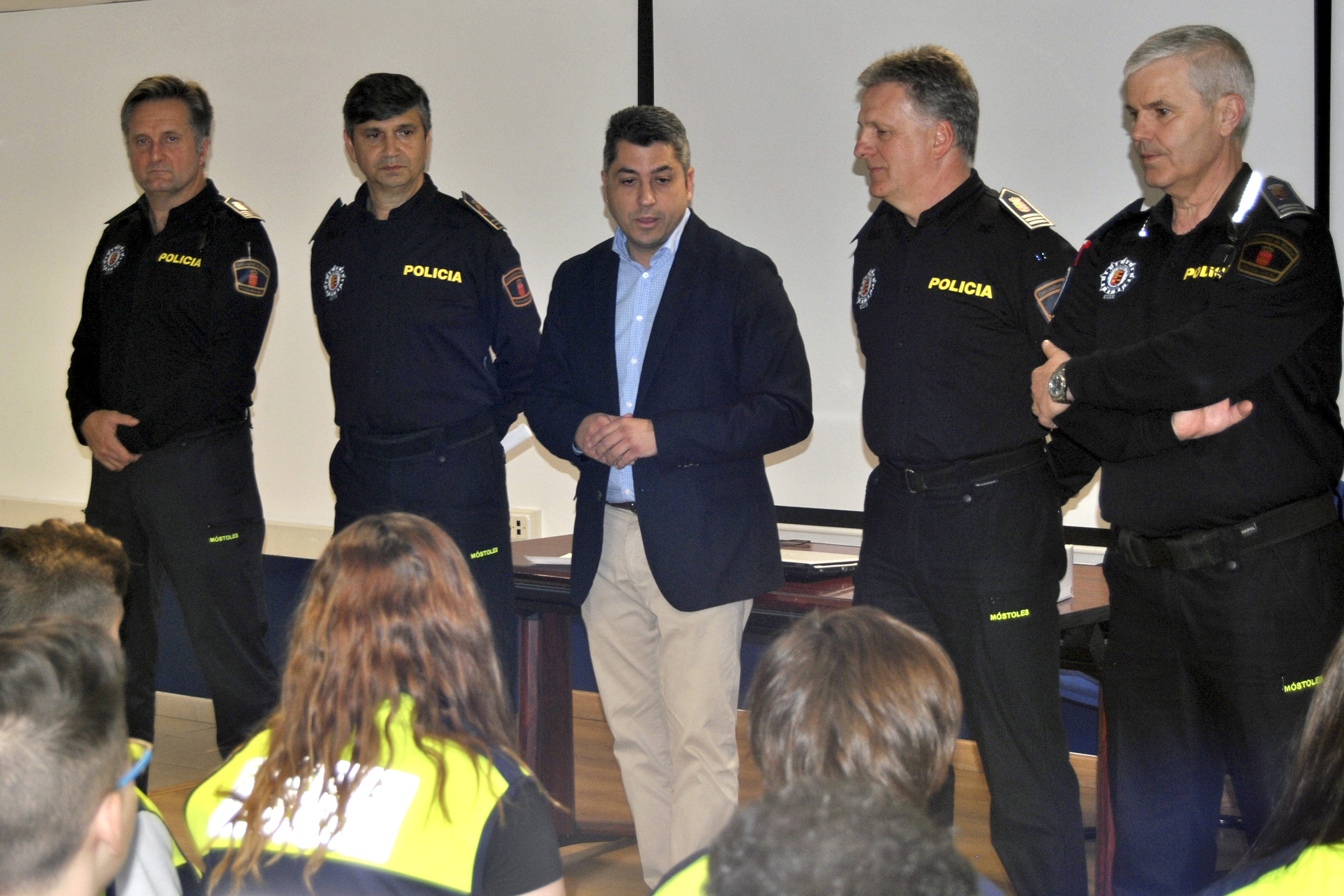 Entrega diplomas a 4ºESO 1Imagen en alta resolución. Este enlace se abrirá mediante lightbox, puede haber un cambio de contextoEntrega diplomas a 4ºESO 1El concejal de Presidencia, Seguridad Ciudadana y Movilidad, Roberto Sánchez, ha entregado los diplomas a los alumnos que han participado en el proyecto 4ºESO+Empresa. Este programa ha consistido en una estancia educativa de los estudiantes en las dependencias de la Policía Municipal, periodo durante el cual, 38 alumnos de seis institutos de Móstoles (Clara Campoamor, Gabriel Cisneros, Colegio Villaeuropa, Antonio de Nebrija, Miguel de Cervantes y Juan Gris), han tenido la oportunidad de conocer el trabajo diario de la Policía Municipal de Móstoles. Los jóvenes han participando en actividades prácticas de la mano de los agentes y responsables de las diferentes áreas y unidades operativas, lo que les ha permitido comprender sus funciones y su organización, acercando así la labor policial a estos alumnos.