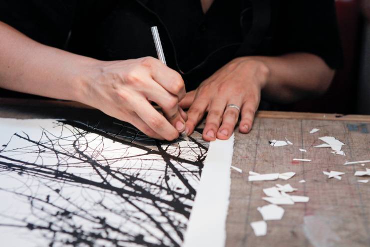 Además, estampa los grabados originales sobre papel artesanal de gran calidad y , tras recortar las estampas a mano con bisturí, monta finalmente los grabados dentro de un marco contenedor en maderas trabajadas artesanalmente, confiriendo a la obra acabada su especial e impactante carácter, totalmente novedoso en este arte.