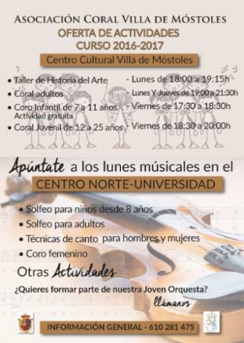 Imagen en alta resolución. Este enlace se abrirá mediante lightbox, puede haber un cambio de contextoLa Asociación Coral Villa de Móstoles abre el curso 2016-2017 con un amplio programa de actividades para todas las edades, que se impartirán en el Centro Cultural Villa de Móstoles y en el Centro Socio Cultural Norte-Universidad.