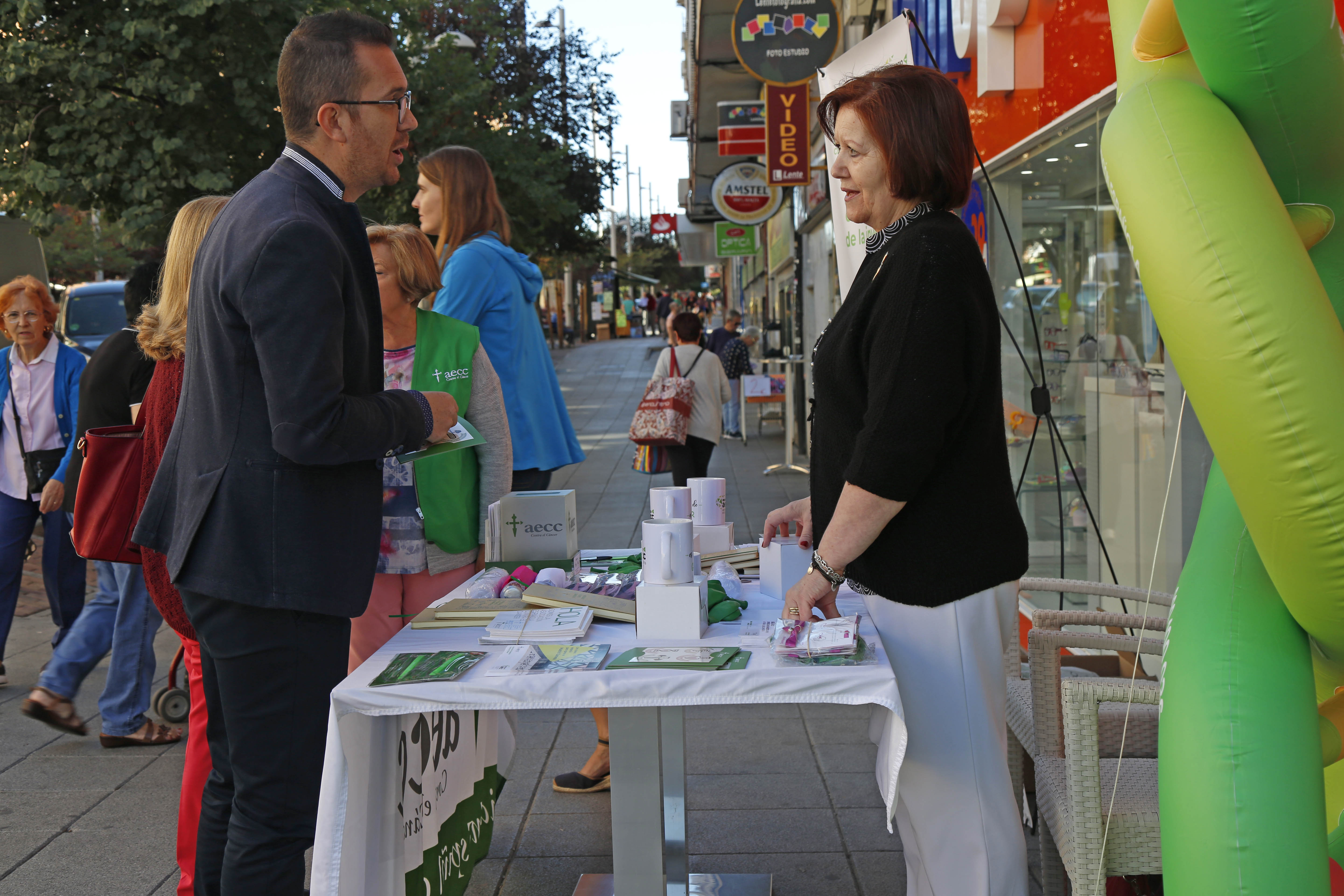 Imagen en alta resolución. Este enlace se abrirá mediante lightbox, puede haber un cambio de contextoEl primer teniente de alcaldesa, David Muñoz, y la concejala de Derechos Sociales y Mayores, Dolores Triviño, han visitado esta mañana la mesa informativa que la Asociación Española contra el Cáncer de Móstoles (AECC) ha instalado en la Avenida de la Constitución, con motivo del Día Mundial de la Investigación en Cáncer (WCRD en sus siglas en inglés)