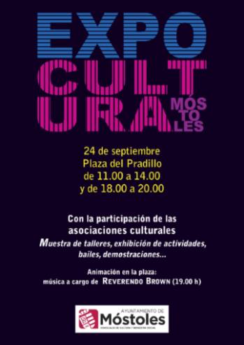 Imagen en alta resolución. Este enlace se abrirá mediante lightbox, puede haber un cambio de contextoLas asociaciones culturales de Móstoles, en colaboración con la concejalía de Cultura y Bienestar Social, han programado una jornada al aire libre para difundir y explicar los talleres y actividades que realizarán en la ciudad a partir de octubre. Se trata de la segunda edición de `Expocultura 2016´, que tendrá lugar este sábado 24 de septiembre, en la Plaza del Pradillo, de 11.00 a 14.00 horas y de 18.00 a 20.00 horas.Lajornada finalizará con un concierto del grupo local Reverendo Brown, a partir de las 19 horas, interpretando versiones de funky y soul.