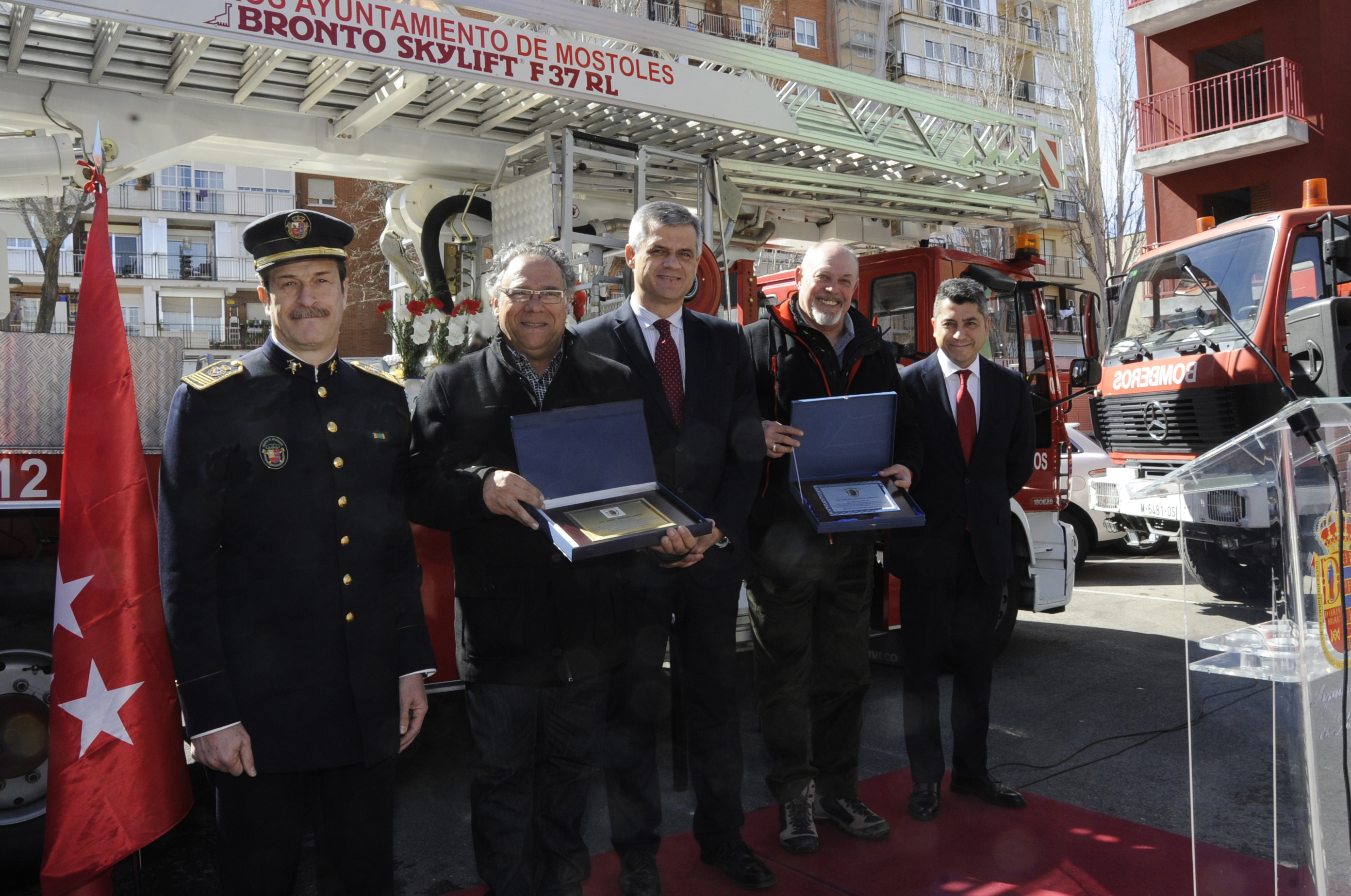 Imagen en alta resolución. Este enlace se abrirá mediante lightbox, puede haber un cambio de contextoEl Alcalde de Móstoles, David Lucas, el concejal de Presidencia, Seguridad Ciudadana, Movilidad y Comunicación, Roberto Sánchez, portavoces de los grupos municipales, el Jefe de Bomberos, José Javier Guijarro, junto a representantes de la Policía Municipal, Policía Nacional y Protección Civil, protagonizaron esta mañana el acto institucional con motivo de la celebración del patrón de los Bomberos.