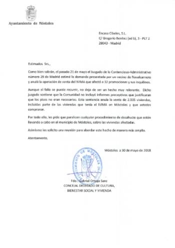 En la reunión, el Concejal les informó del envío de una carta oficial desde el Ayuntamiento a la empresa solicitando oficialmente la paralización de todos los procesos de desahucios que estuvieran llevando a cabo en Móstoles, en virtud de la sentencia que anula la compra que efectuaron en 2013. Además, y a petición de las familias y de una representación de Stop Desahucios, todas las partes acordaron trabajar para poner a todo el Pleno Municipal detrás de esta defensa a través de una moción en el próximo pleno, en la que se refuerce la petición hecha a la empresa y se haga extensivo el compromiso de la Concejalía a toda la institución.