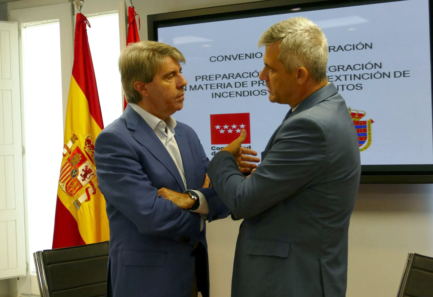 Imagen en alta resolución. Este enlace se abrirá mediante lightbox, puede haber un cambio de contextoEl alcalde de Móstoles, David Lucas, y el consejero de Presidencia, Justicia y Portavocía de la Comunidad de Madrid, Ángel Garrido, han firmado esta mañana un convenio de preparación de la integración en materia de prevención, extinción de incendios y salvamento, así como en materia de colaboración técnica y de formación. A la rúbrica también han asistido el concejal de Presidencia, Seguridad Ciudadana y Movilidad, Roberto Sánchez y el director general de Protección Ciudadana de Madrid, Carlos Novillo.