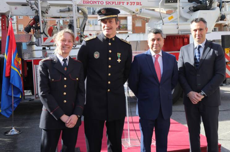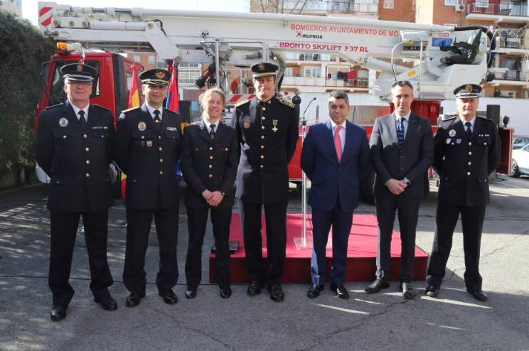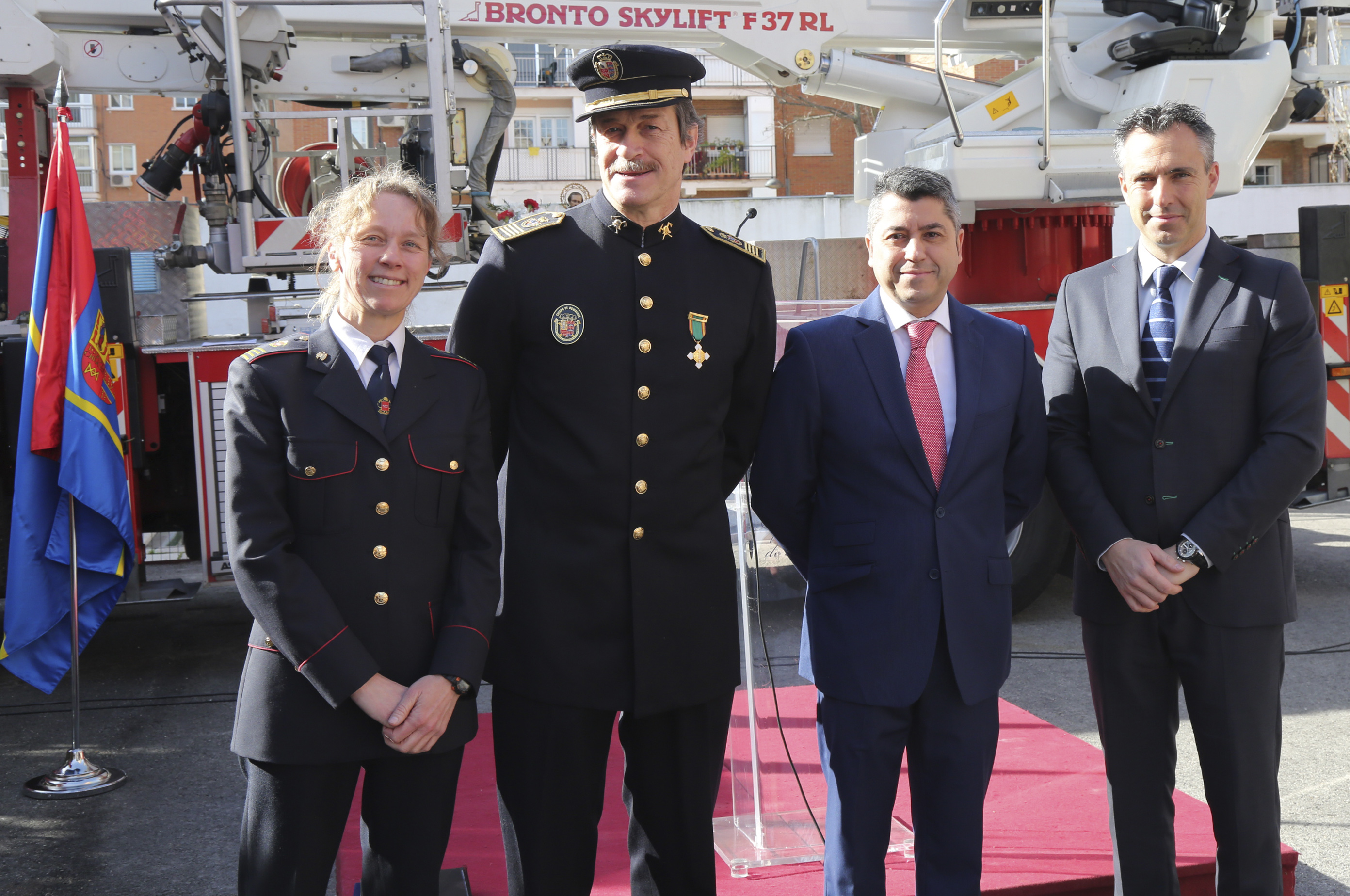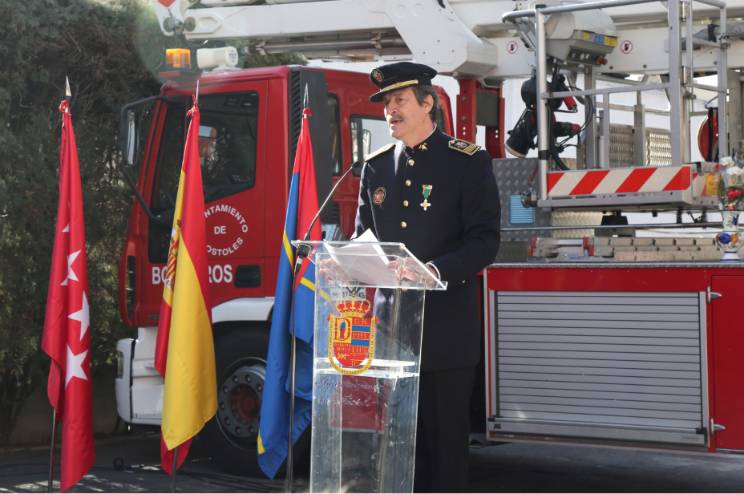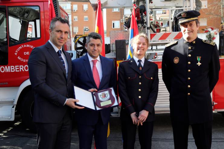 Durante el acto, el director general de Protección Ciudadana Carlos Novillo y la jefa del Cuerpo de Bomberos de la Comunidad de Madrid, Ana Karin Coll Eriksson, han recibido sendas distinciones por parte del Ayuntamiento de Móstoles.