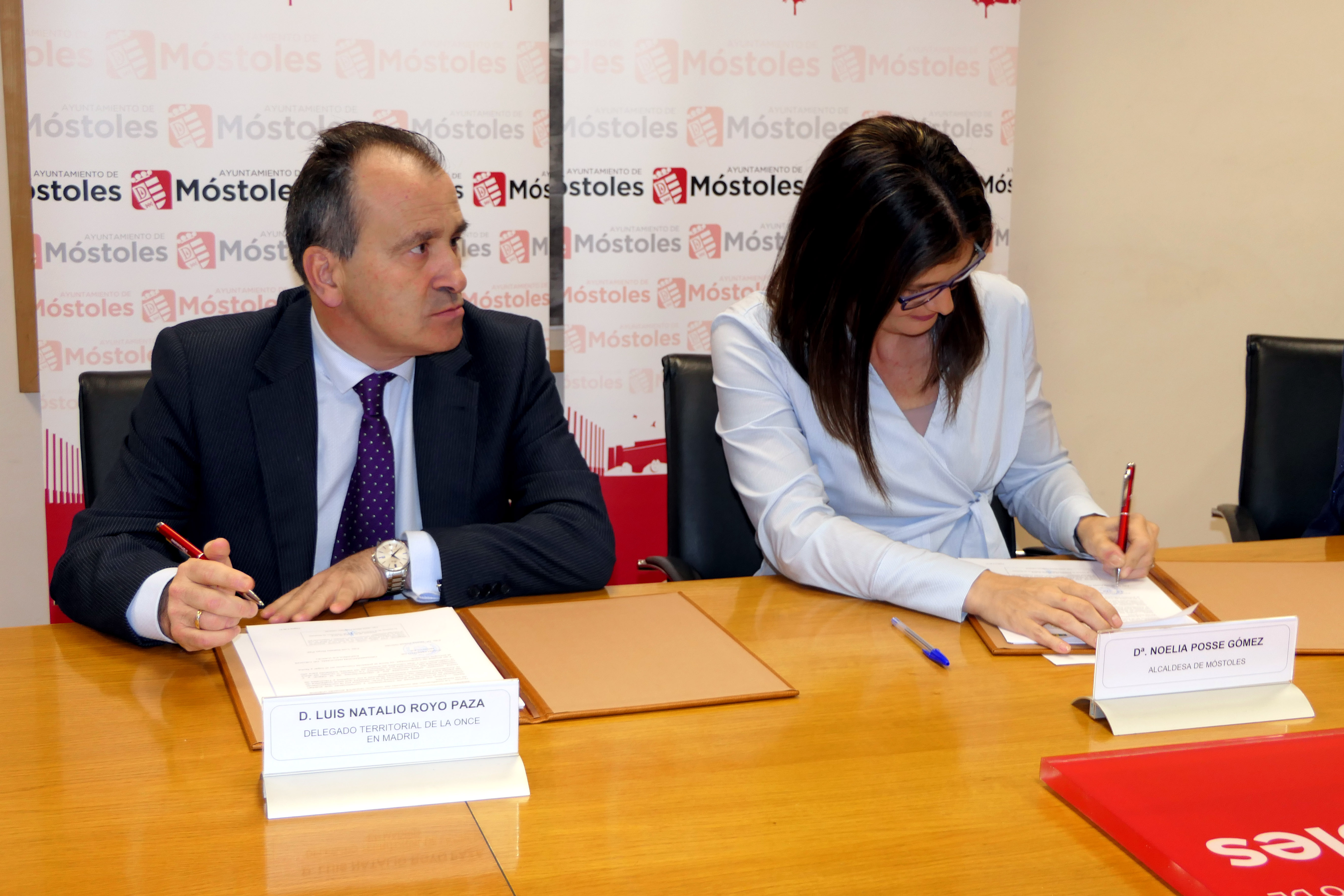 Imagen en alta resolución. Este enlace se abrirá mediante lightbox, puede haber un cambio de contextoLa alcaldesa de Móstoles, Noelia Posse y el delegado territorial de la ONCE en Madrid, Luis Natalio Royo, han firmado un convenio de colaboración por medio del cual la Organización Nacional de Ciegos llevará a cabo la modernización de los 44 quioscos instalados en el municipio y que se destinan a la venta de productos de juego. En el acto también han estado presentes la concejala de Igualdad, Sanidad y Mayores, Ana María Rodrigo y el director de la Agencia de la ONCE en Móstoles, Federico Prats.