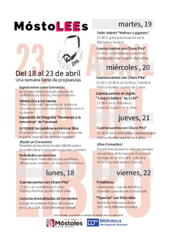 Con motivo del Día del Libro, el próximo 23 de abril, durante la semana del 18 al 23 de abril, la Biblioteca Municipal de Móstoles ha organizado un amplio programa de actividades culturales dirigidas a todos los públicos. El objetivo de esta iniciativa de la Concejalía de Cultura y Deportes, es acercar el libro, la lectura y los servicios de la Biblioteca a todos los vecinos y vecinas del municipio.