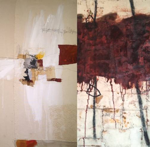 Papel reciclado y telas presentes en el estudio dan forma a la base de sus lienzos, engrosando la superficie, que después cubre de color; un color sobrio, natural, marcado por la presencia absoluta de los tonos tierras, anaranjados, y por los procesos de oxidación natural a los que somete a sus pinturas.