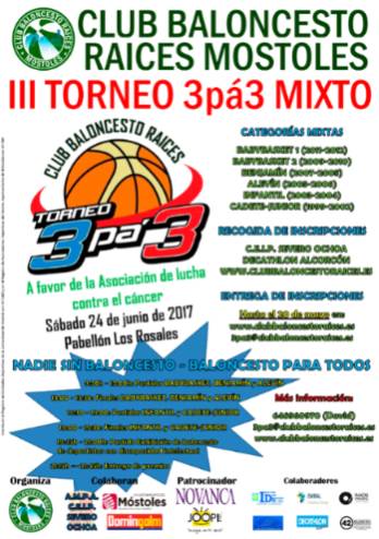 Imagen en alta resolución. Este enlace se abrirá mediante lightbox, puede haber un cambio de contextoLa Concejalía de Deportes del Ayuntamiento de Móstoles colabora en el III Torneo 3pa´3 Mixto de Baloncesto, organizado por el Club Baloncesto Raíces Móstoles. La competición, cuya recaudación se destinará a la Asociación de Lucha contra el Cáncer, se celebrará el sábado 24 en el Pabellón Los Rosales del municipio. En él intervendrán la categorías babybasket, benjamín, alevín, infantil y cadete-junior.