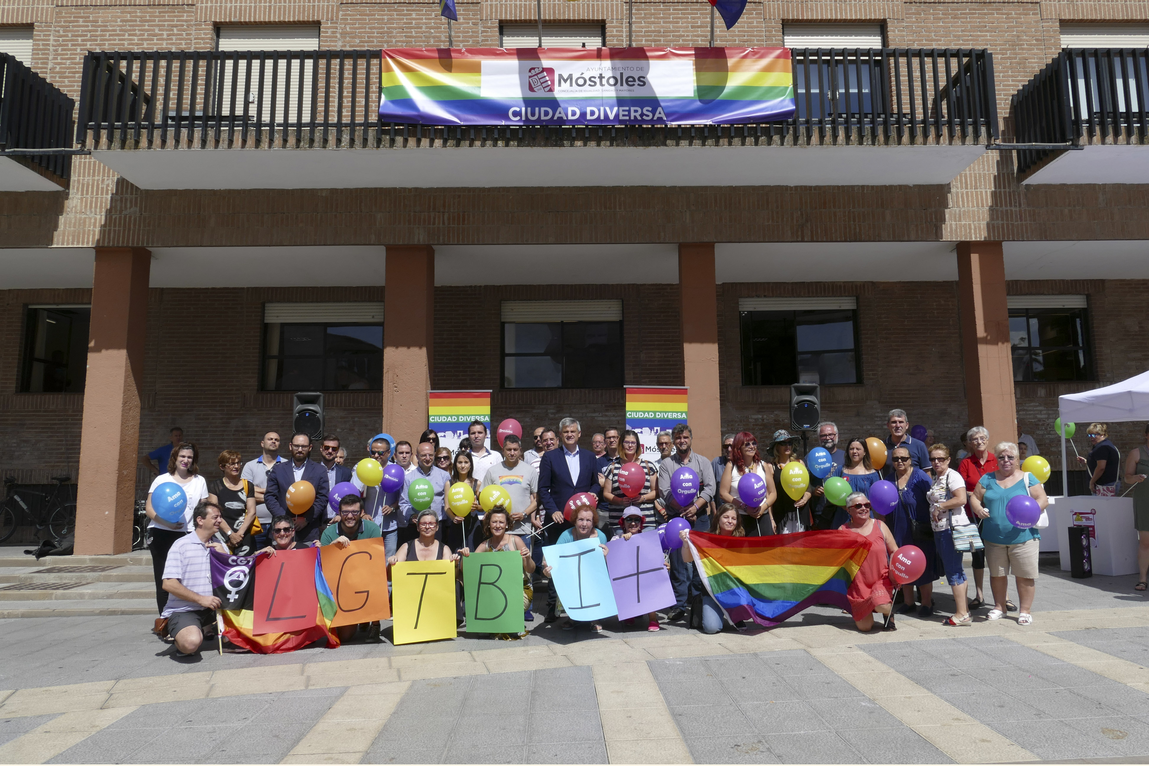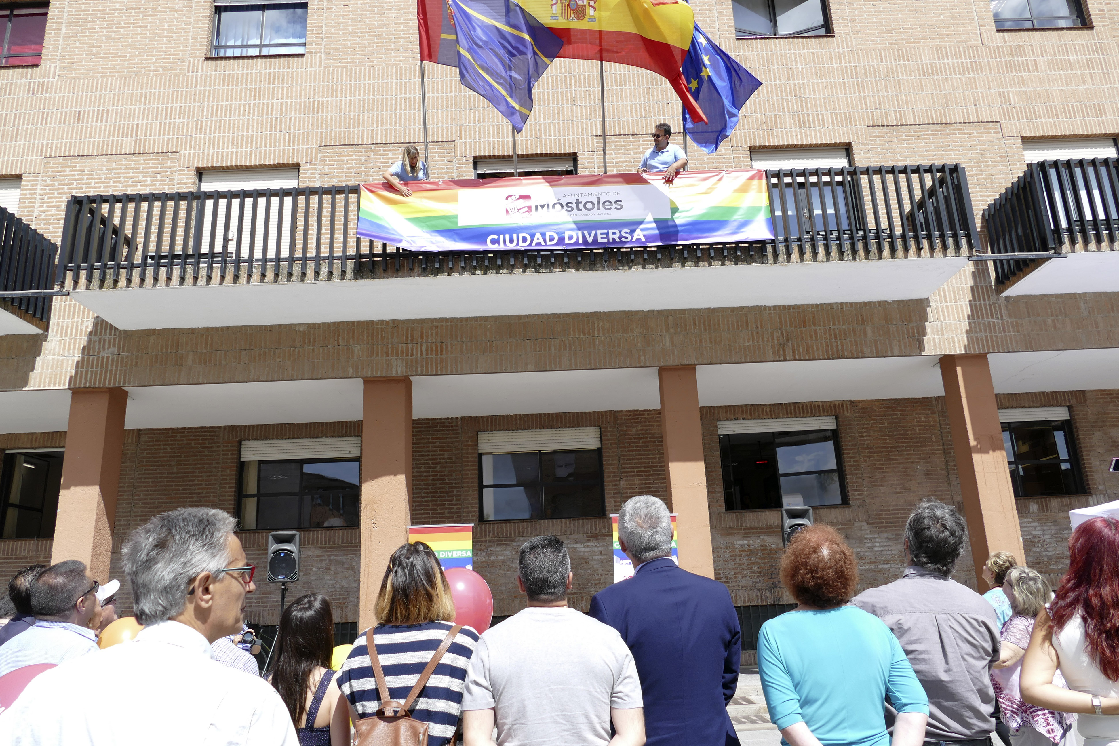 Imagen en alta resolución. Este enlace se abrirá mediante lightbox, puede haber un cambio de contextoPara conmemorar el Día del Orgullo LGTBI, que oficialmente se celebra el miércoles 28, el Ayuntamiento de Móstoles ha desplegado, esta mañana, una bandera arco iris en el balcón de la casa consistorial. Además, a continuación, se ha procedido a la lectura de un manifiesto a favor de los derechos del colectivo LGTBI. En el acto ha participado el Equipo de Gobierno, miembros de la Corporación y representantes de asociaciones y colectivos LGTBI, como Arcópoli.