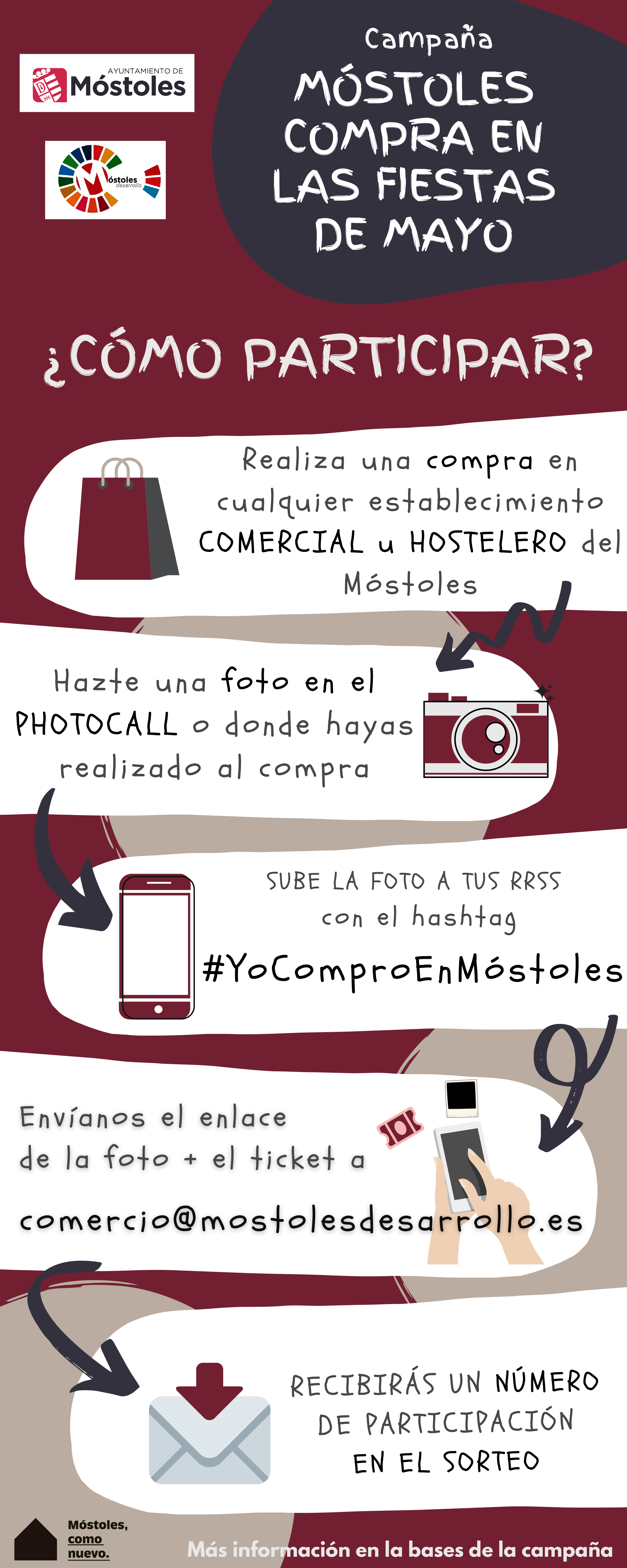 - Para promocionar las compras en el municipio, el Gobierno Local pone en marcha la campaña "Móstoles Compra en las Fiestas de Mayo". Las personas que realicen sus compras estos días en el comercio o la hostelería local podrán ganar diferentes premios, entre ellos dos estancias de una noche en el Hotel Ciudad de Móstoles con desayuno buffet incluido para dos personas.