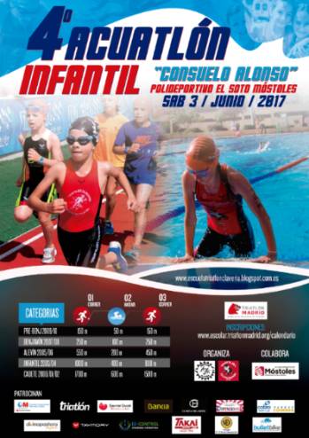 Cartel Acuatlon Mostoles _Consuelo AlonsoImagen en alta resolución. Este enlace se abrirá mediante lightbox, puede haber un cambio de contextoCartel Acuatlon Mostoles _Consuelo AlonsoMañana sábado 3 de junio a partir de las 10:00h, en el Polideportivo Andrés Torrejón, se va a celebrar un Acuatlón, un deporte con gran auge y con mucha participación, está dirigido a niños y niñas de 7 a 16 años, donde el 40% de los participantes son niñas, por lo tanto la presencia femenina es muy alta.