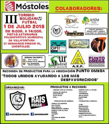 Imagen en alta resolución. Este enlace se abrirá mediante lightbox, puede haber un cambio de contextoEl Polideportivo Municipal de Villafontana acogerá, este domingo 1 de julio en horario de 9 a 14 horas, el III Torneo Solidario de Fútbol Sala, organizado por Sparta de Móstoles F.S y RAIS Fundación Móstoles F.C., con la colaboración del Ayuntamiento de Móstoles, Concejalía de Deportes.