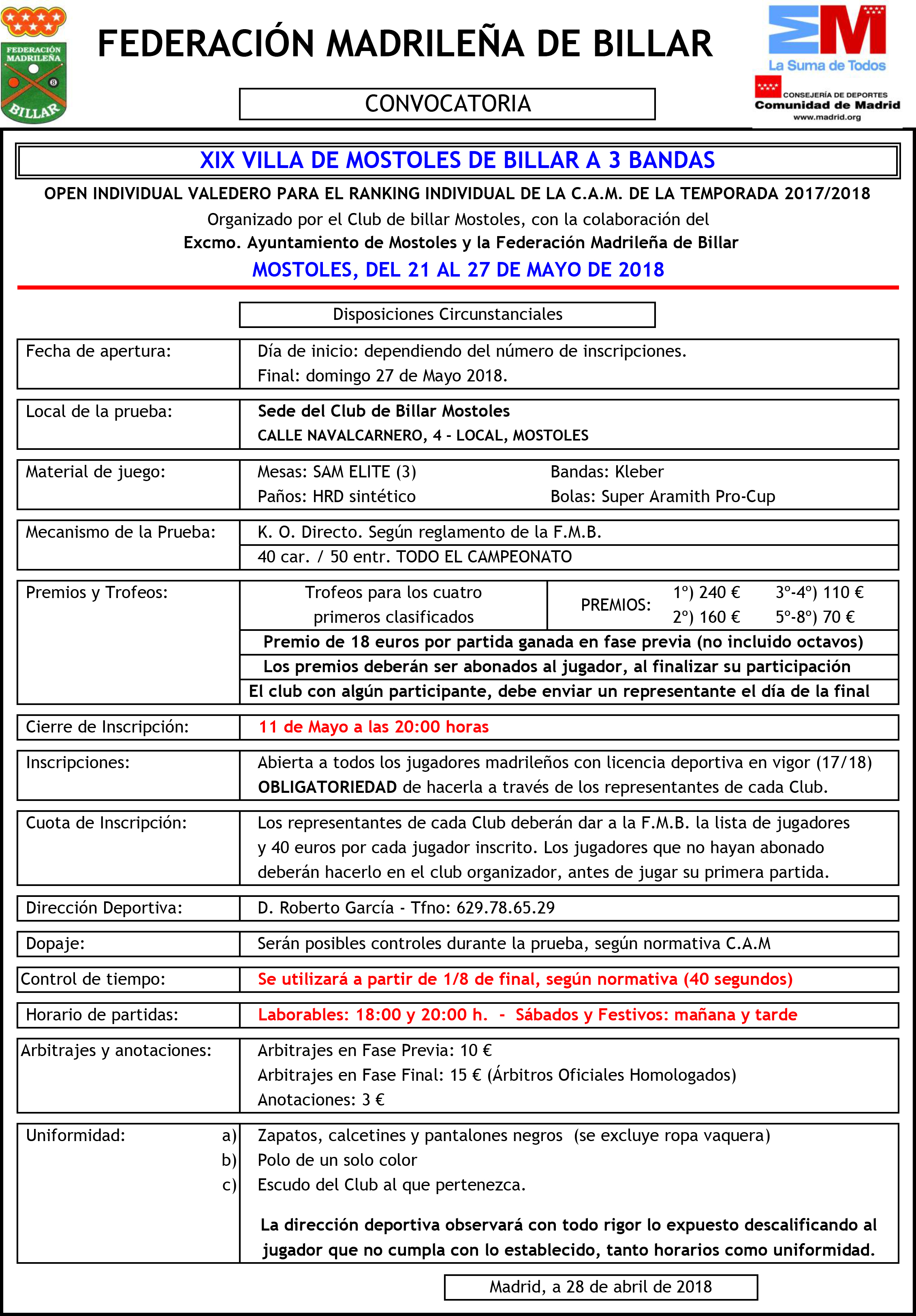 Imagen en alta resolución. Este enlace se abrirá mediante lightbox, puede haber un cambio de contextoLa competición se está celebrando desde el 21 al 27 de mayo en la sede del Club Billar Móstoles (Calle Navalcarnero, 4 Local), y en la misma participan aproximadamente 55 billaristas de distintos clubes de la Comunidad de Madrid. El torneo cuenta con la colaboración de la Concejalía de Deportes y de la Federación Madrileña de Billar.