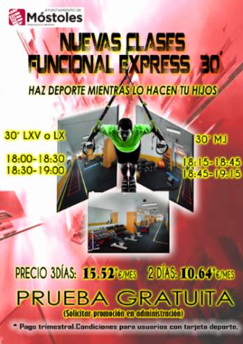 Imagen en alta resolución. Este enlace se abrirá mediante lightbox, puede haber un cambio de contextoLa Concejalía de Deportes oferta nuevas clases de entrenamiento funcional de 30 minutos dirigidas a mejorar la salud y condición física de los participantes. El entrenamiento funcional es una actividad orientada a mejorar las funciones diarias y a aumentar la calidad de vida de quienes lo practican. Son ejercicios multiarticulares y multimusculares que buscan desarrollar la inteligencia del movimiento humano.