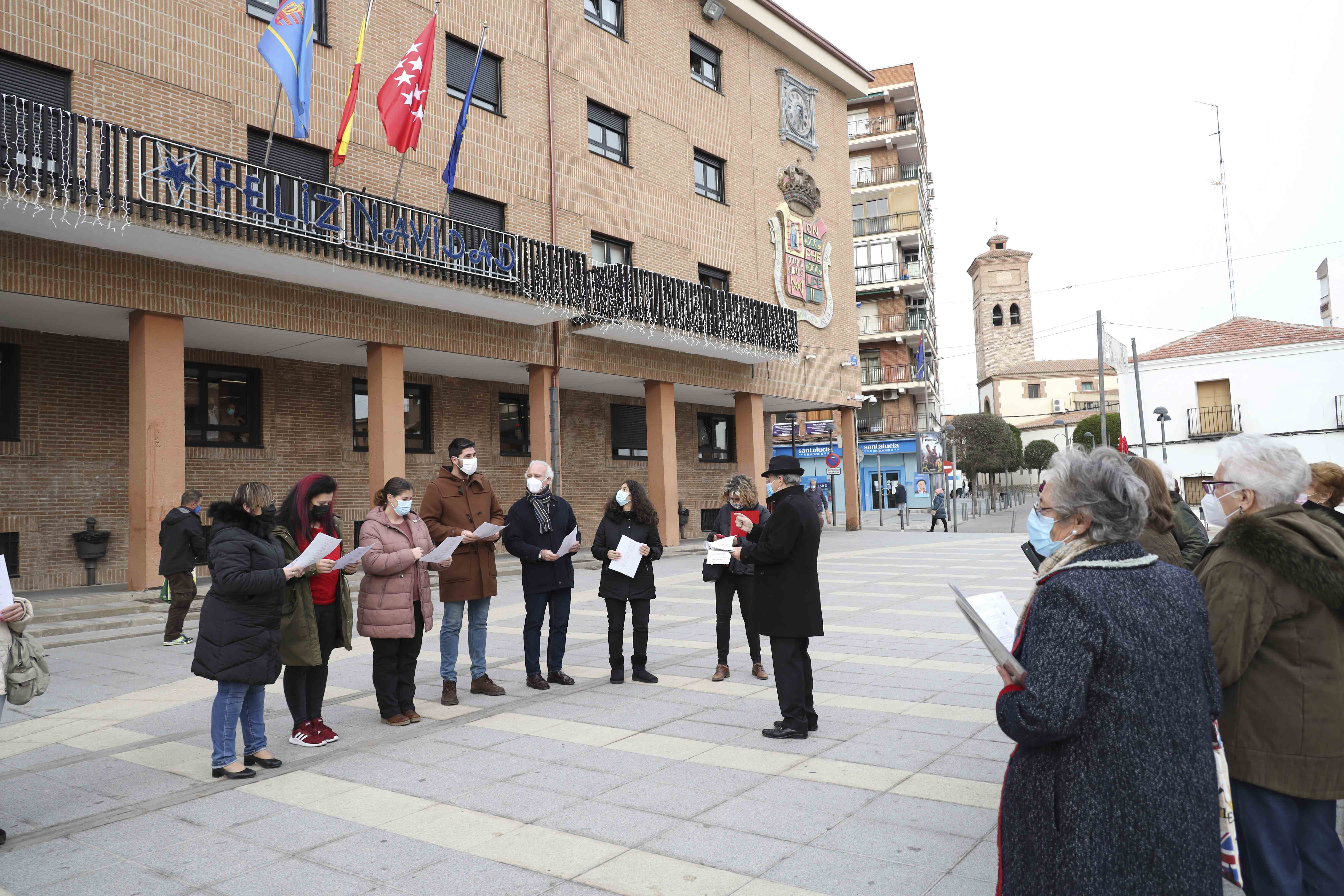 La Coral de Mayores Juan XXIII ha interpretado en la Plaza de la Constitución, frente al Ayuntamiento de Móstoles, su tradicional repertorio de villancicos y canciones navideñas, en el que han participado la Alcaldesa, Noelia Posse, la Concejala de Presidencia y Desarrollo Urbano, Marisa Ruiz, el Concejal de Seguridad, Convivencia y Transición Ecológica, Álex Martín, la Concejala de Derechos Sociales y Mayores, Ángela Viedma, el Concejal de Hacienda, Victorio Martínez, y la Portavoz de Podemos, Mónica Monterreal.