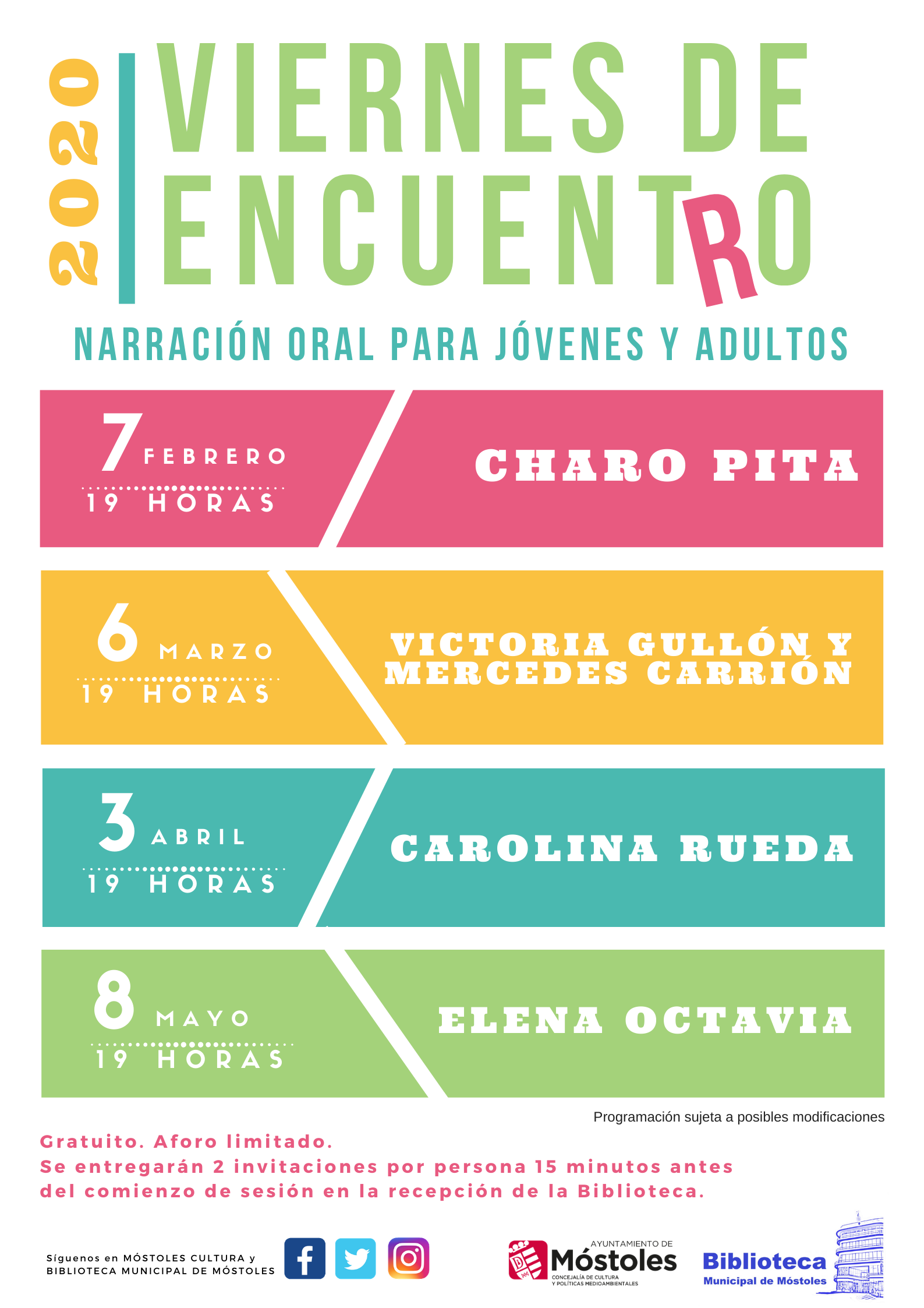 Viernes de Encuentro es un proyecto destinado al público adulto. Se desarrollará los viernes 7 de febrero, 6 de marzo, 3 de abril y 8 de mayo, a las 19 h. Historias que vendrán de lejos como las que nos traerá Carolina Rueda desde Colombia o Charo Pita desde Galicia, o más cercanas como las que narrarán Elena Octavia o Victoria Gullón junto a Mercedes Carrión.