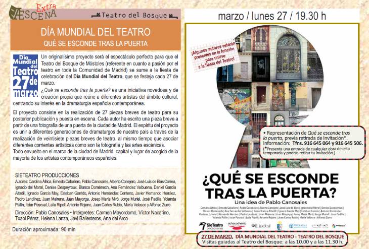 - A Escena Extra ha programado el día 27 la obra "Qué se esconde tras la puerta", con precio gratuito, previa retirada de invitación, presentando una entrada de cualquier obra de esta temporada.