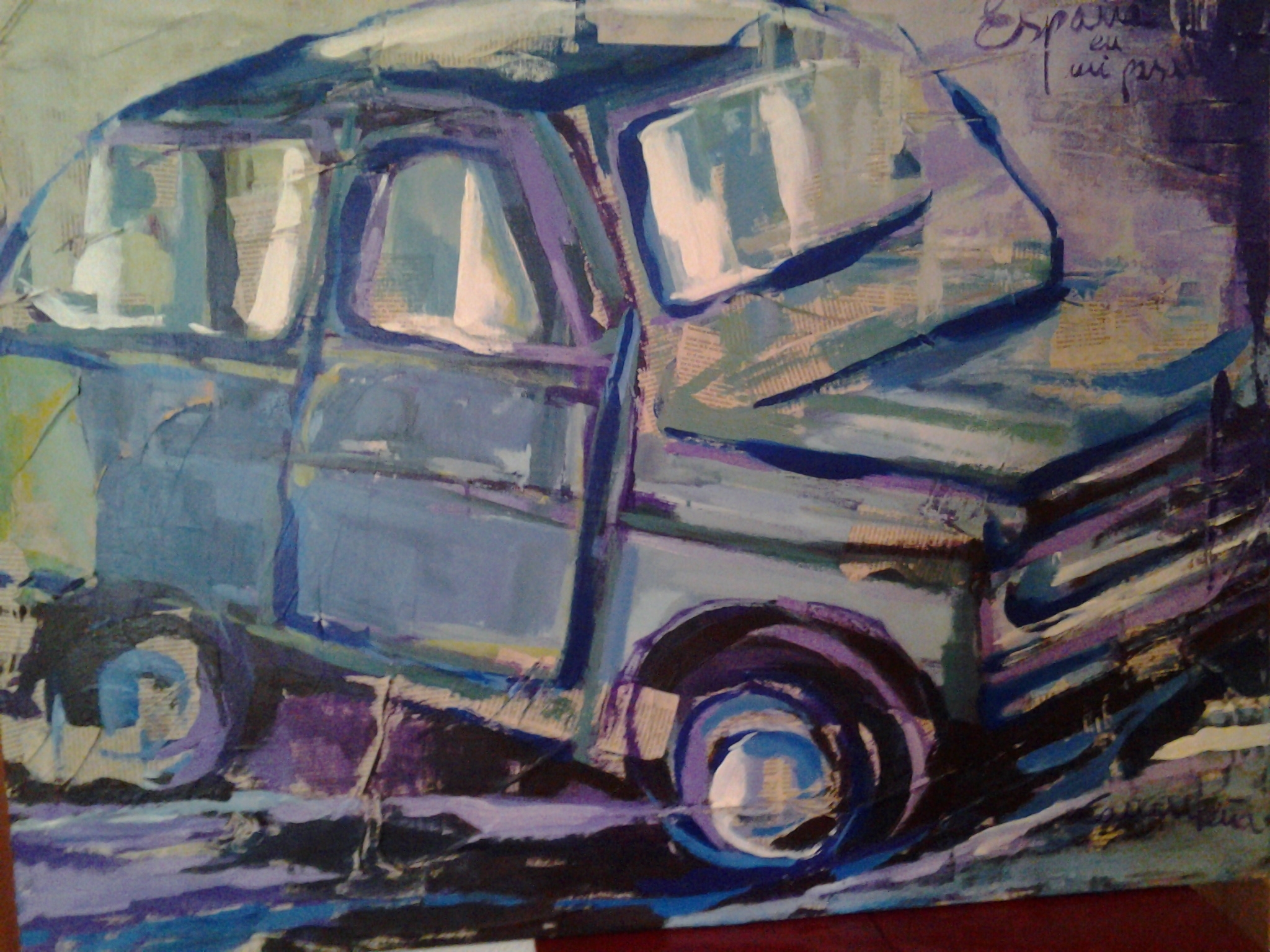 EL COCHE: Es un volver en el tiempo hacia el 600, coche que nos acompañó en nuestro pasado, que hicimos camino con él. Lo hago volver con mis pinceles y lo hago bello, entre azules y rompimientos de la materia, lo dejo inmóvil para que hable desde su lejanía. C.P.A.