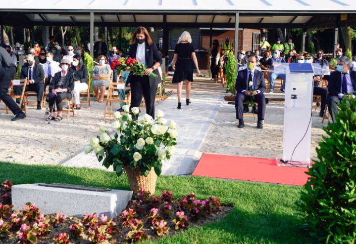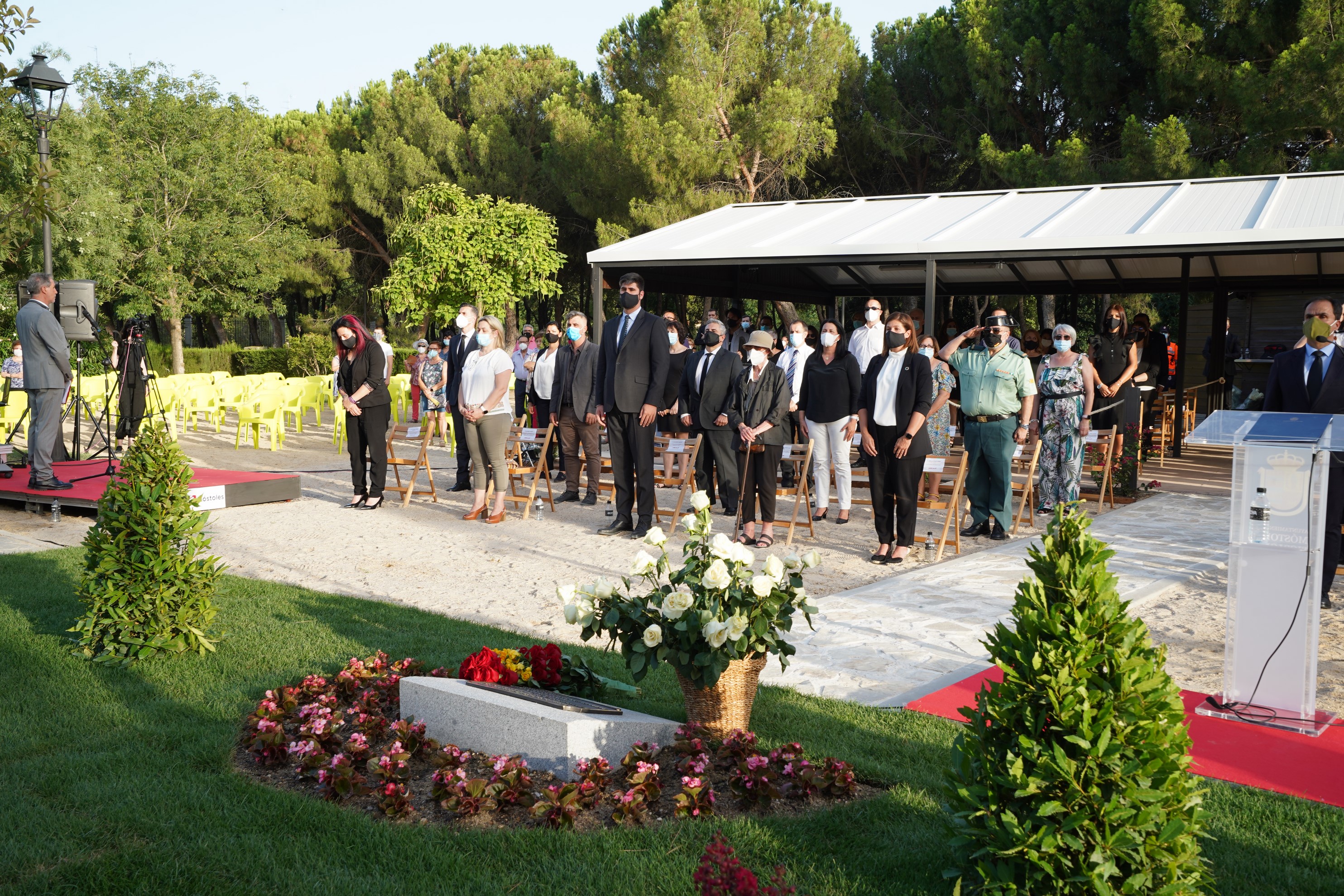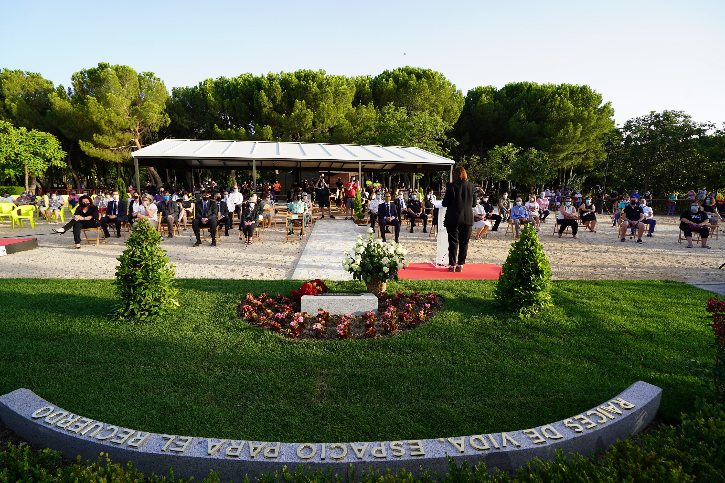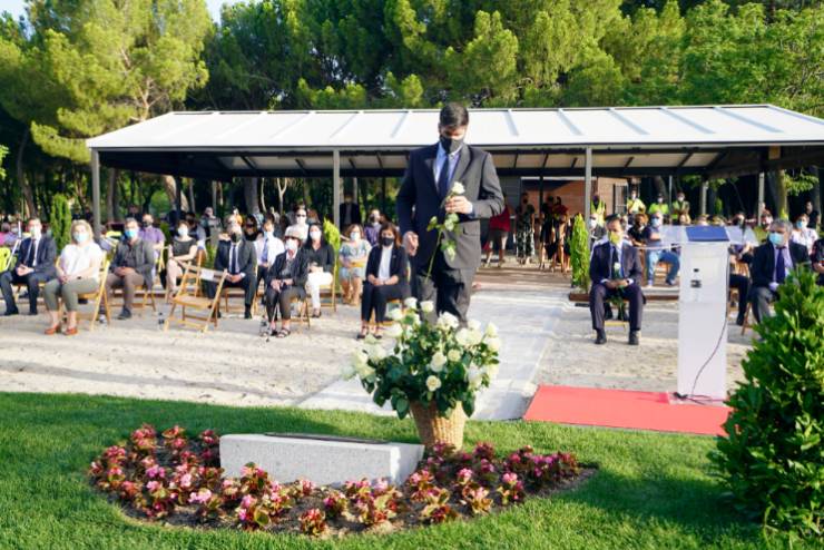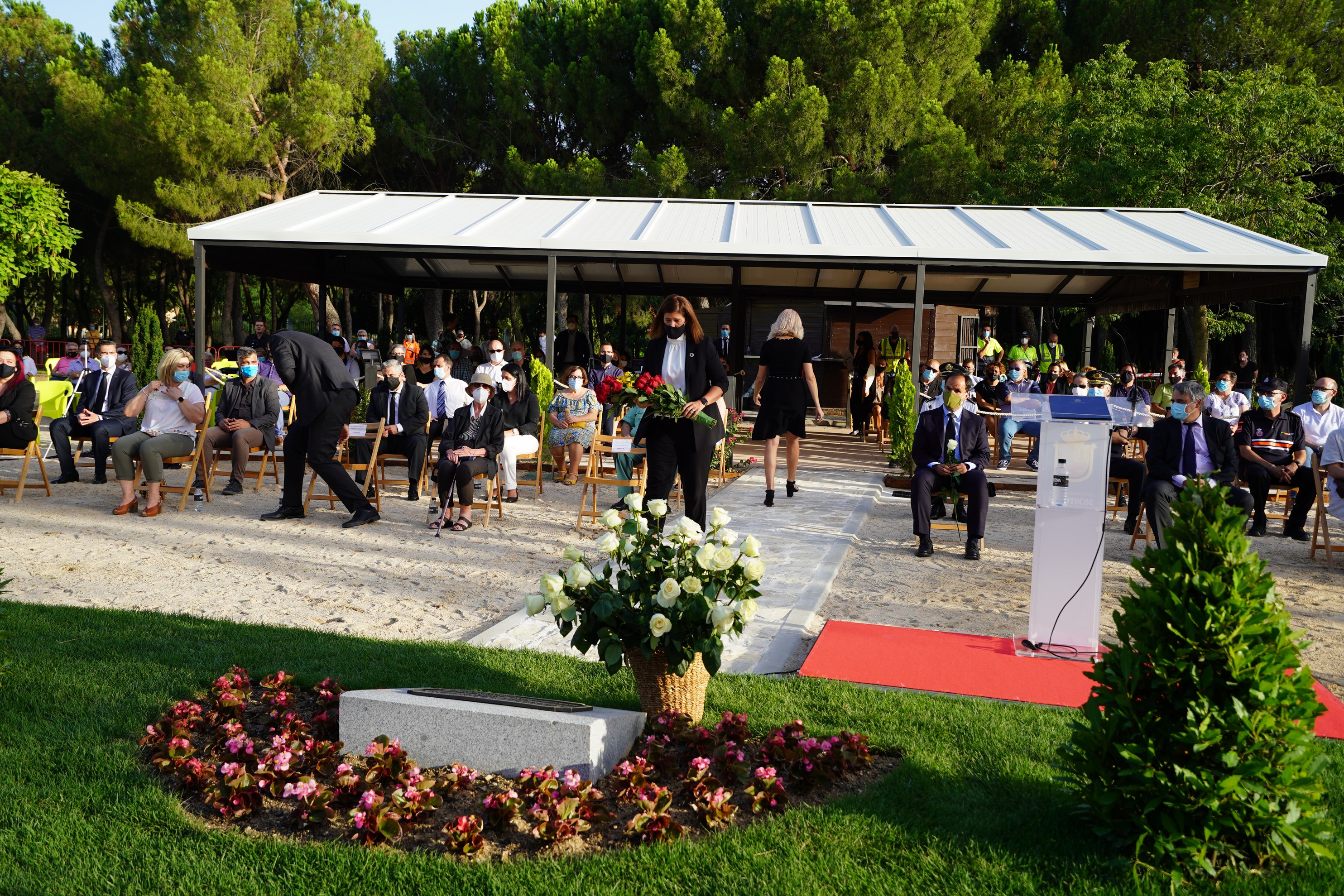 Imagen en alta resolución. Este enlace se abrirá mediante lightbox, puede haber un cambio de contextoEnvuelto en un solemne silencio, al abrigo de los árboles de la Finca Liana, Móstoles ha recordado en un sentido homenaje a todas las víctimas de la COVID-19. Personas con nombres y apellidos que han visto sus vidas segadas por la emergencia sanitaria, mientras sus familias, obligadas por estrictas medidas de seguridad, les decían adiós desde la distancia.