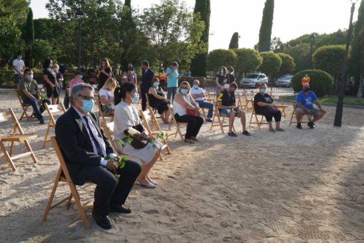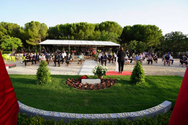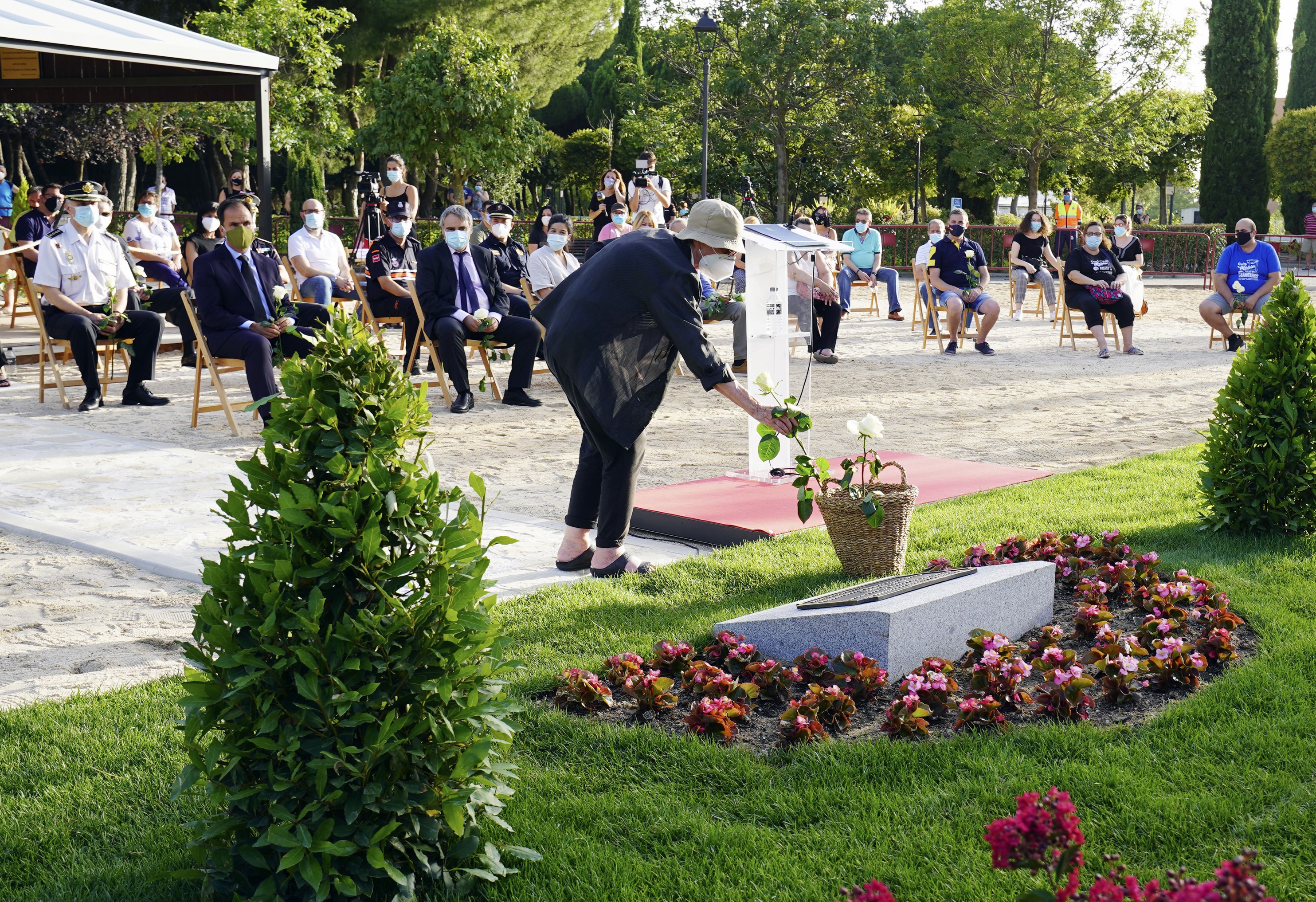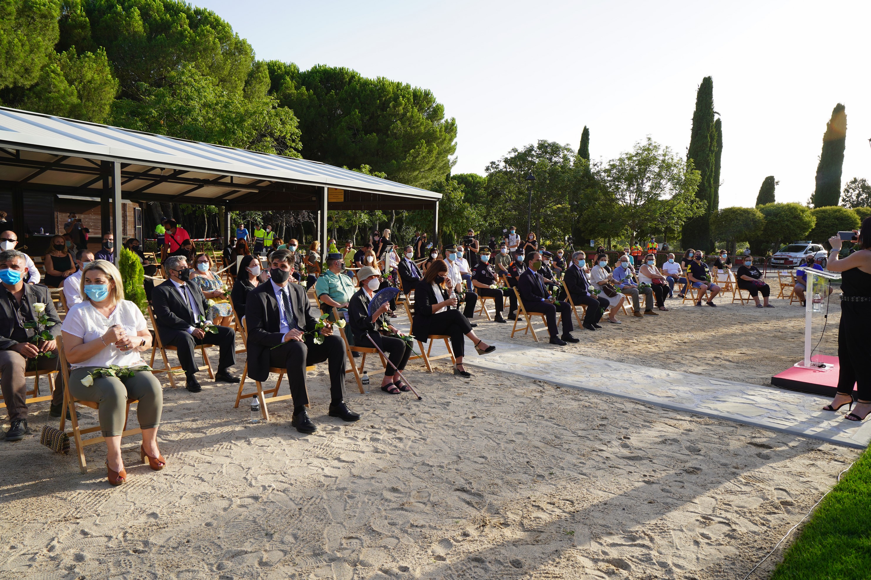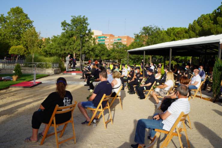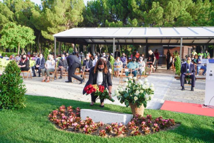 Imagen en alta resolución. Este enlace se abrirá mediante lightbox, puede haber un cambio de contextoEnvuelto en un solemne silencio, al abrigo de los árboles de la Finca Liana, Móstoles ha recordado en un sentido homenaje a todas las víctimas de la COVID-19. Personas con nombres y apellidos que han visto sus vidas segadas por la emergencia sanitaria, mientras sus familias, obligadas por estrictas medidas de seguridad, les decían adiós desde la distancia.