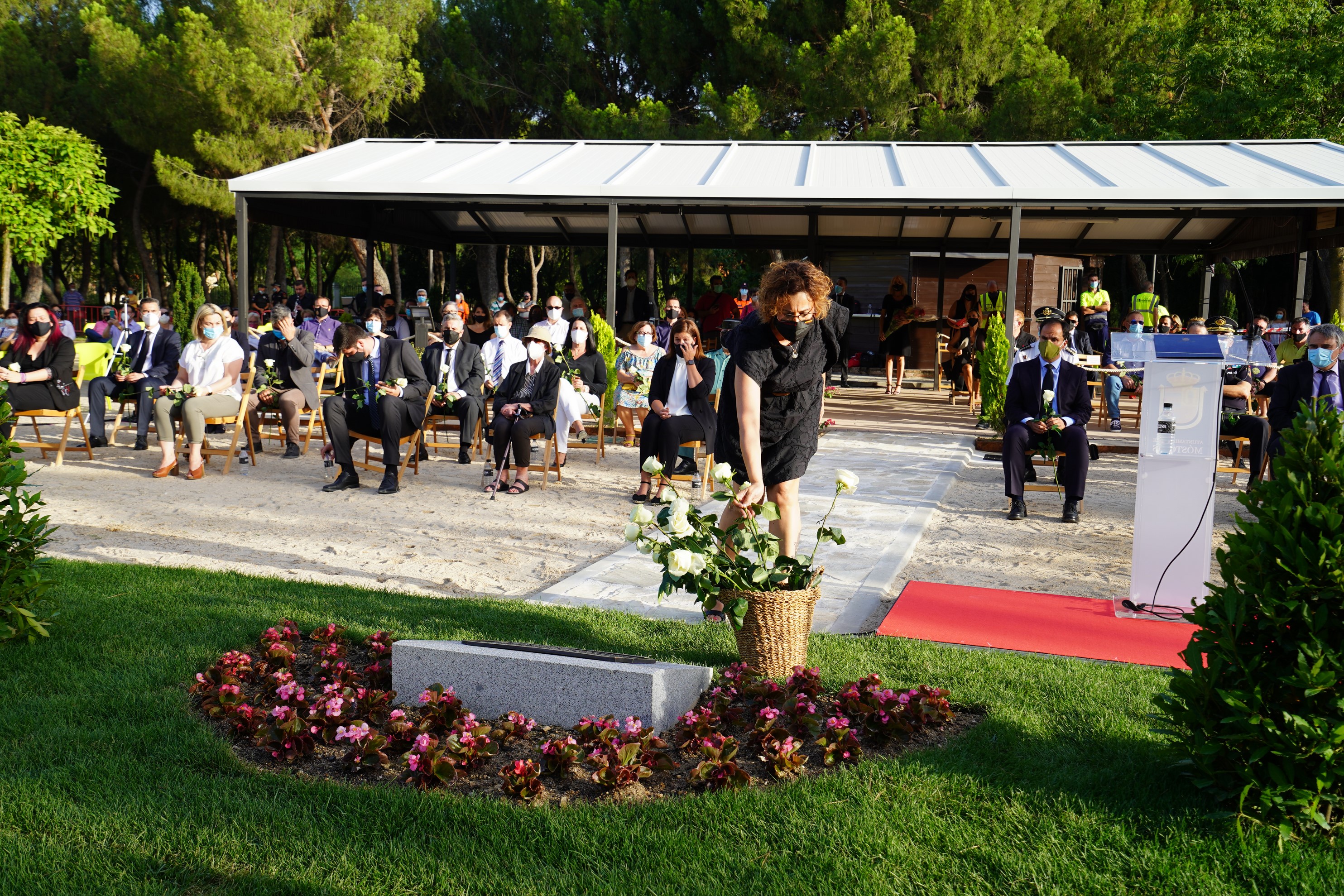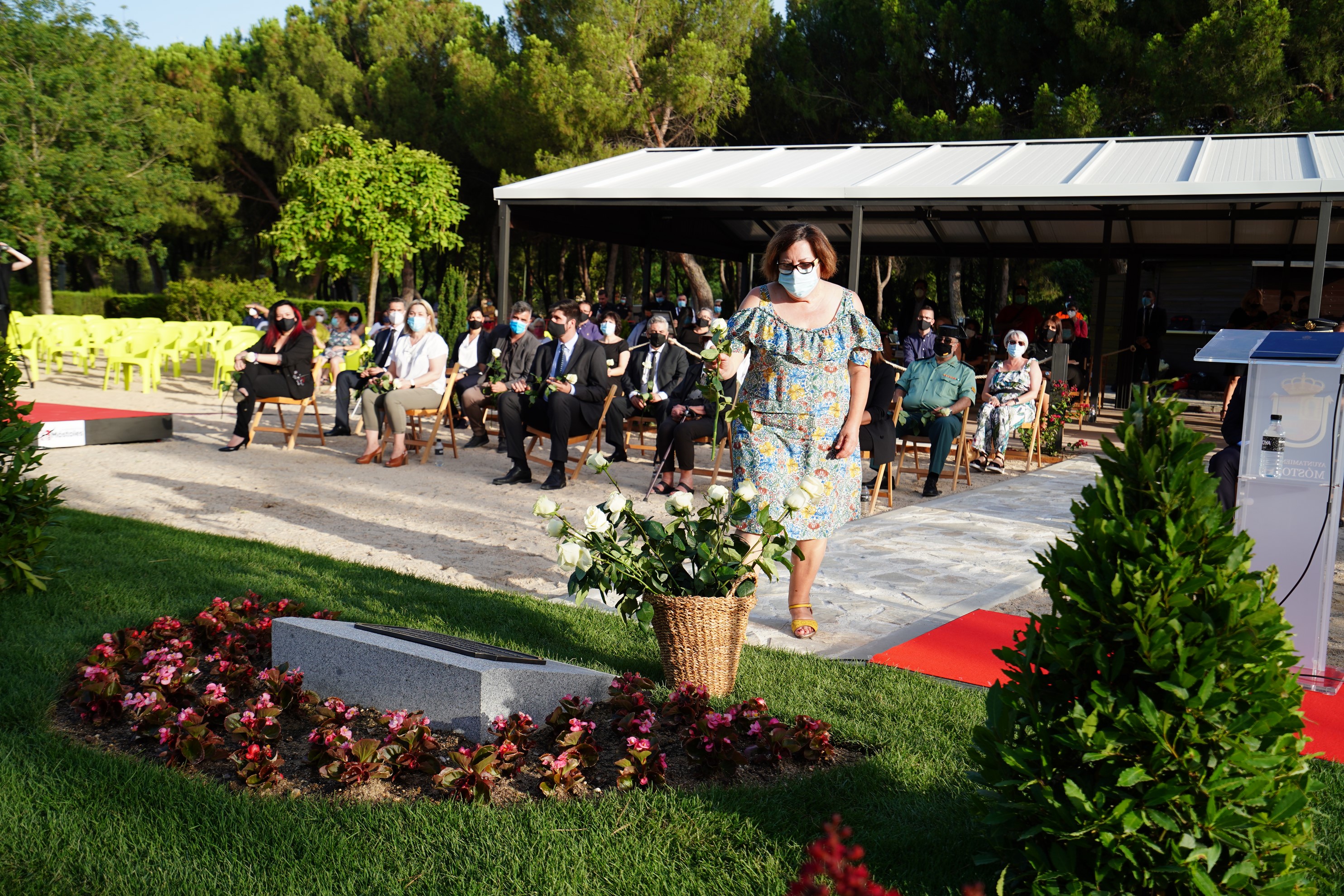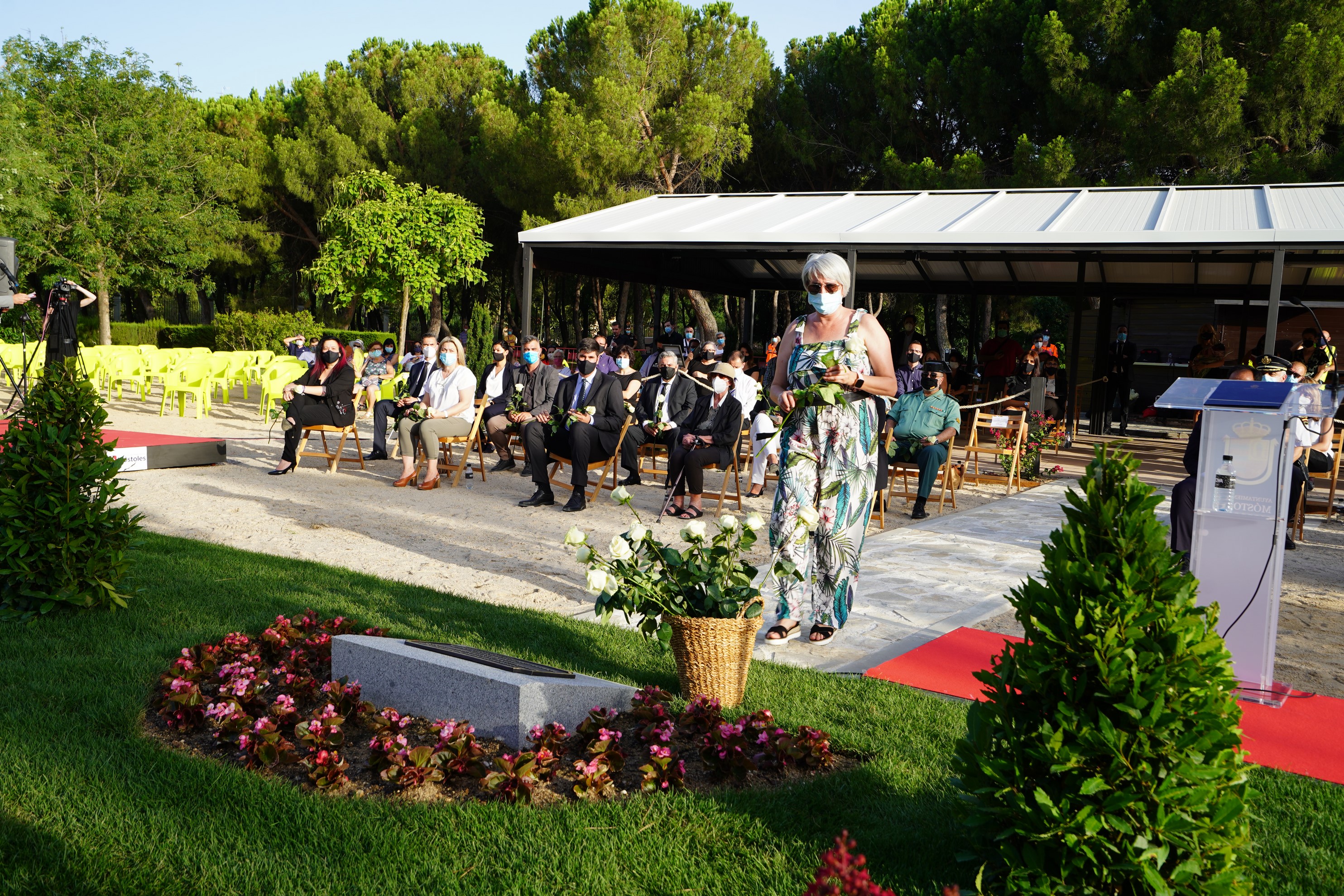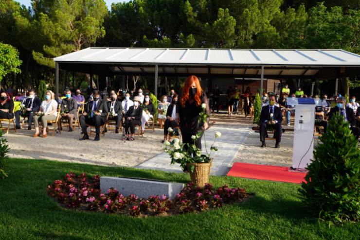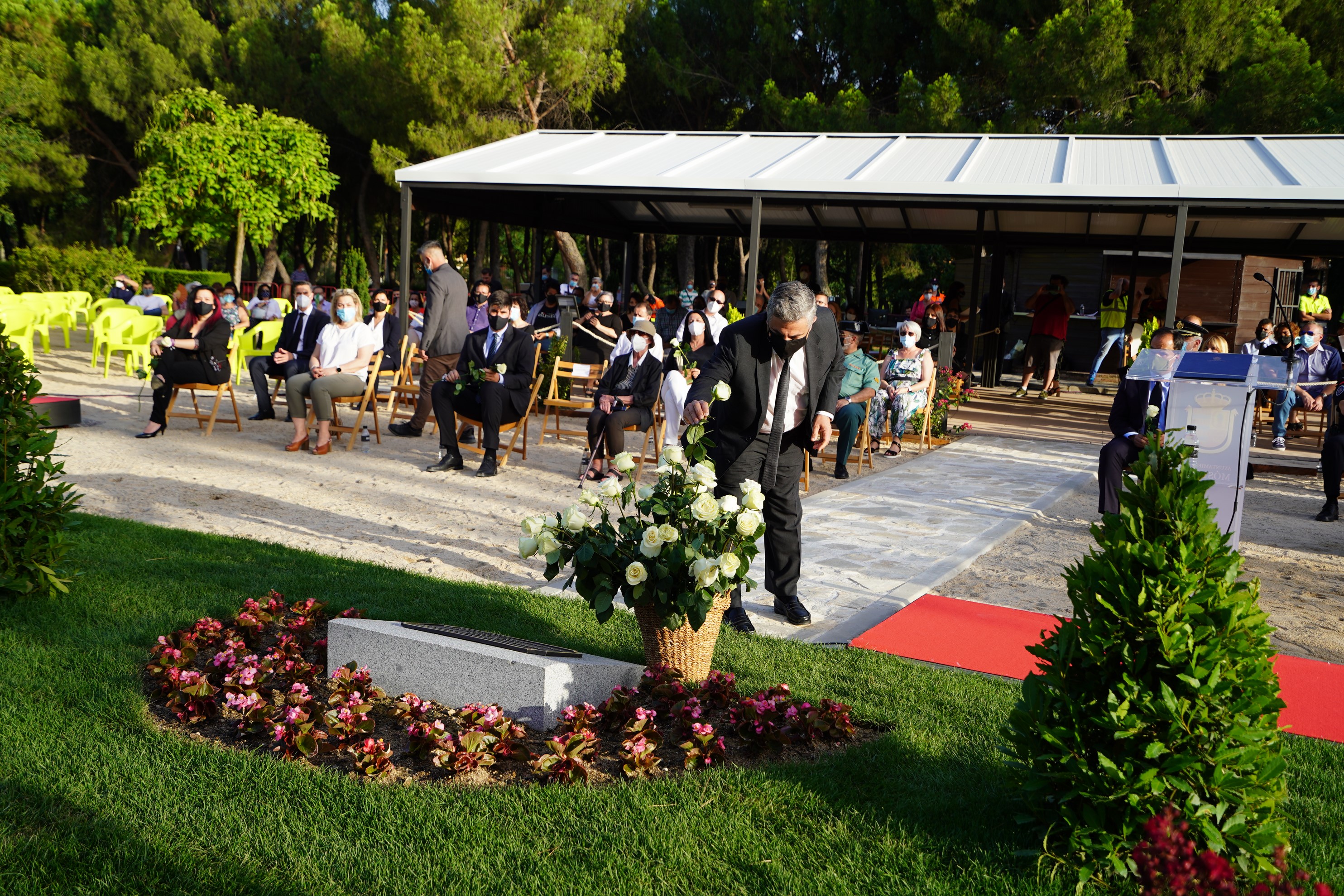 Imagen en alta resolución. Este enlace se abrirá mediante lightbox, puede haber un cambio de contextoEnvuelto en un solemne silencio, al abrigo de los árboles de la Finca Liana, Móstoles ha recordado en un sentido homenaje a todas las víctimas de la COVID-19. Personas con nombres y apellidos que han visto sus vidas segadas por la emergencia sanitaria, mientras sus familias, obligadas por estrictas medidas de seguridad, les decían adiós desde la distancia.
