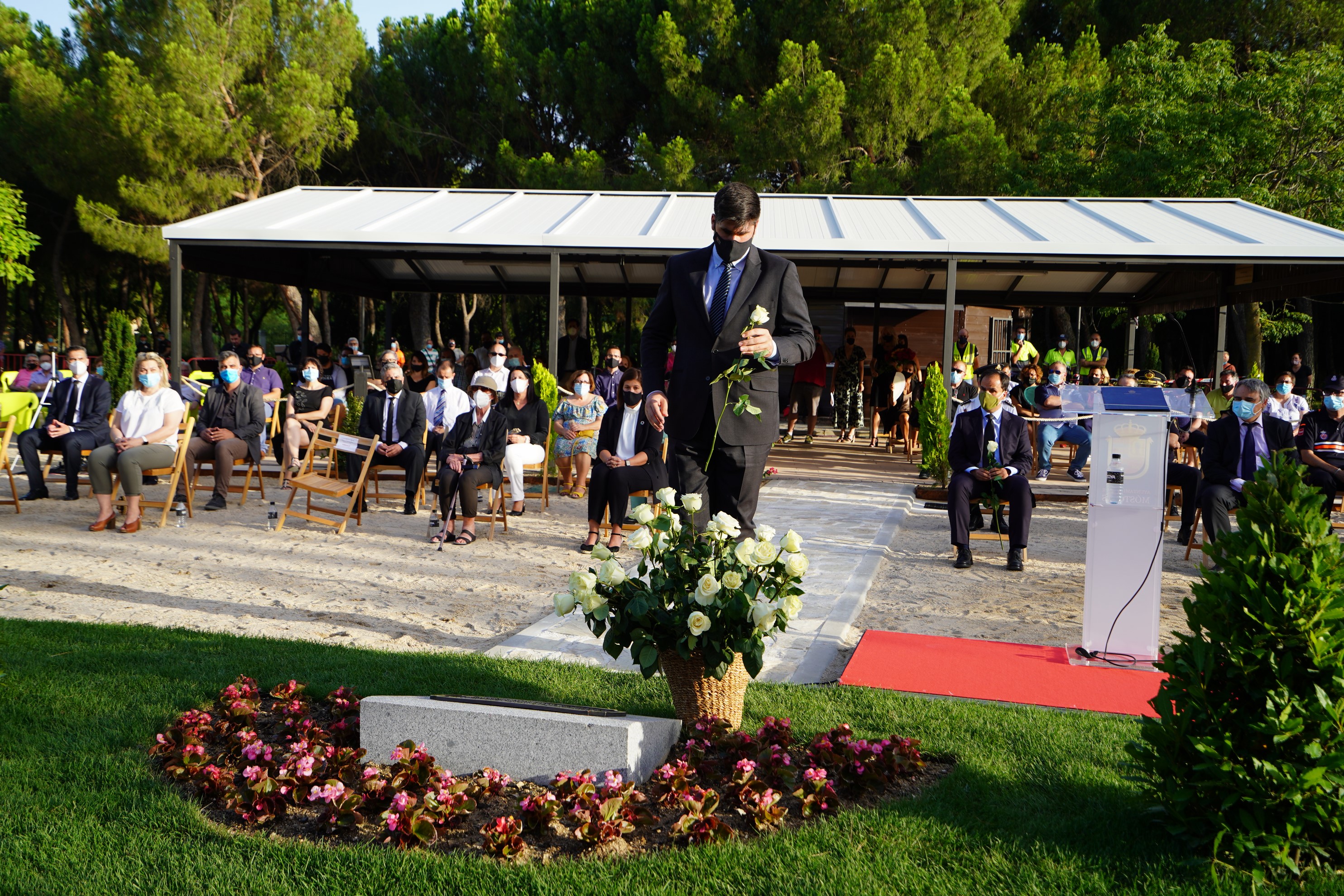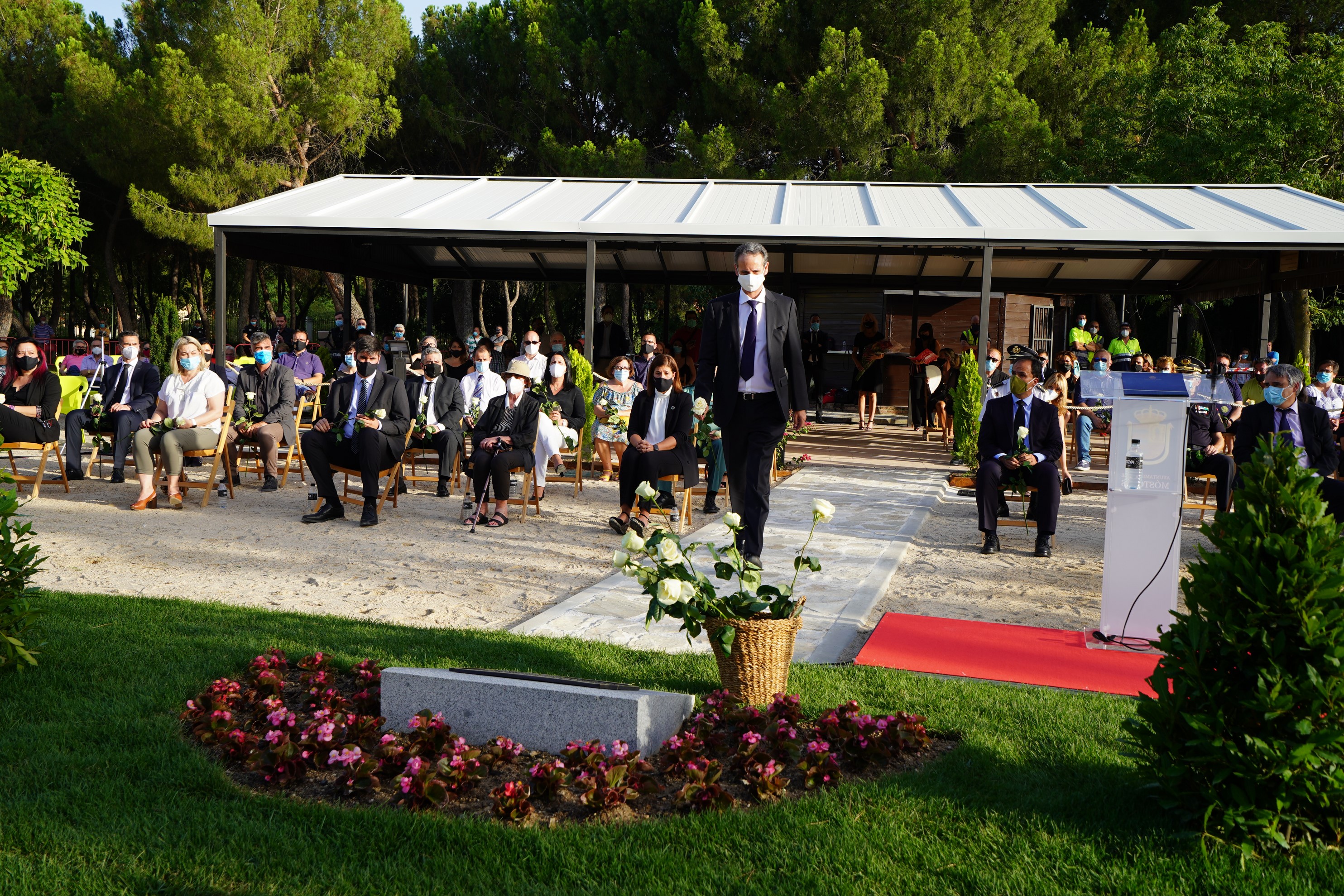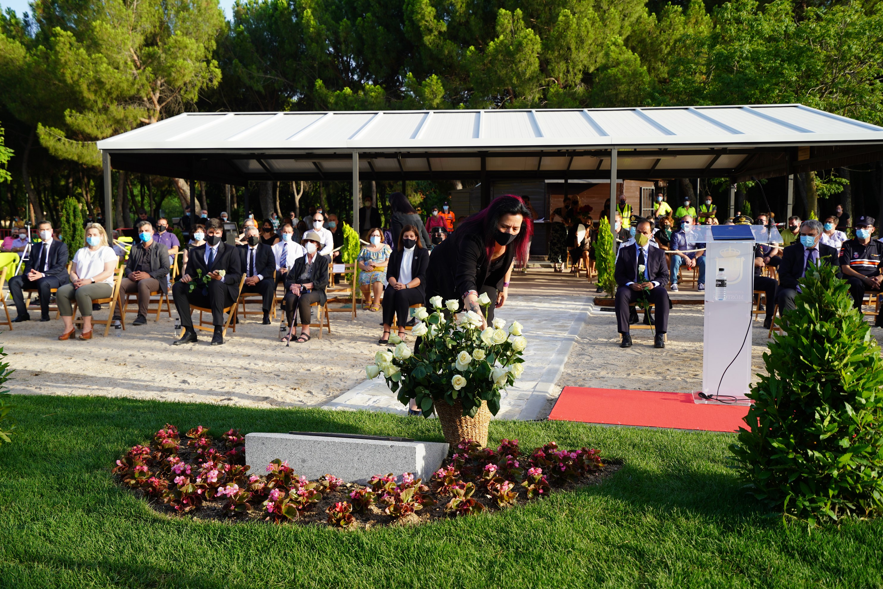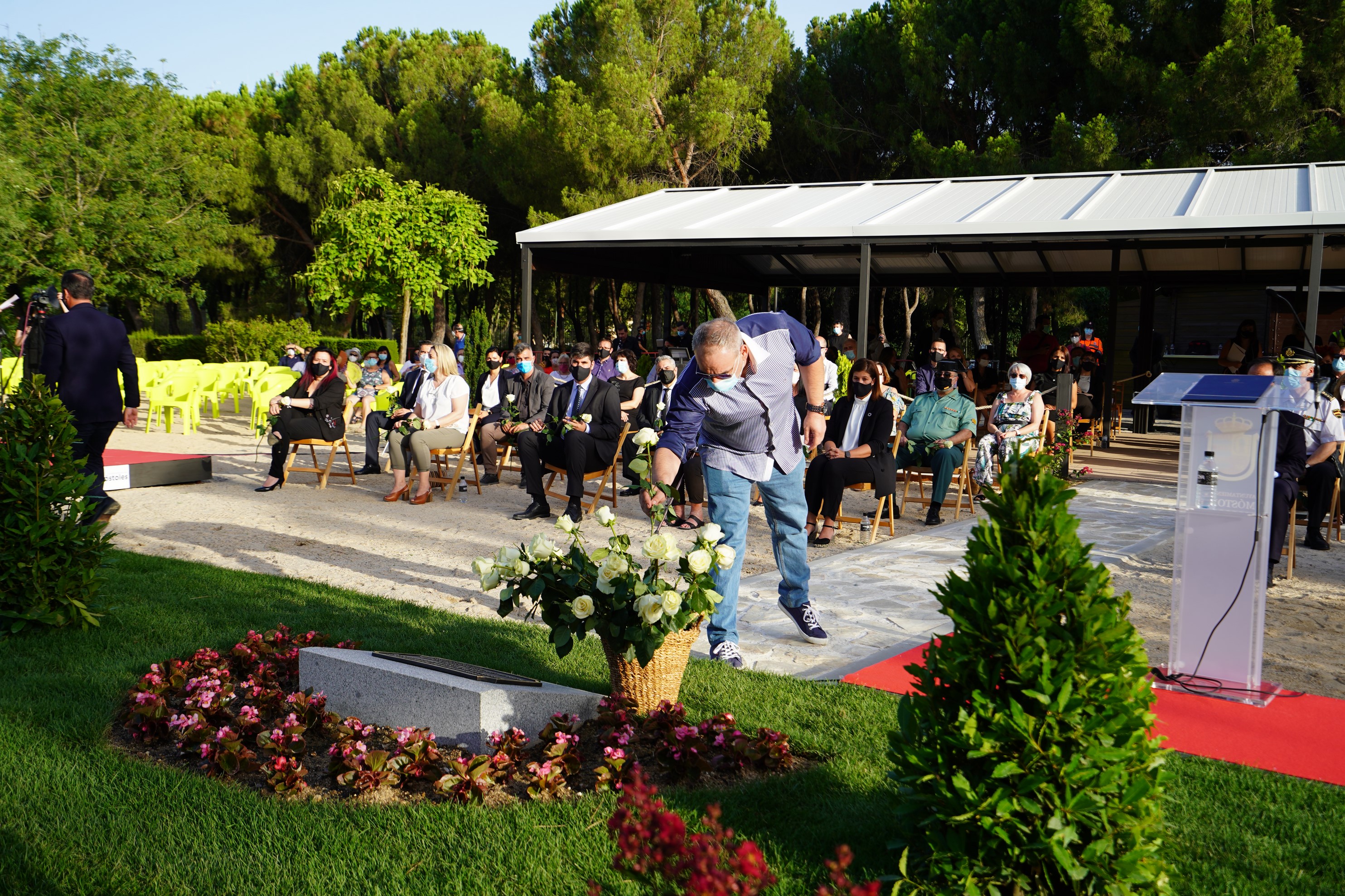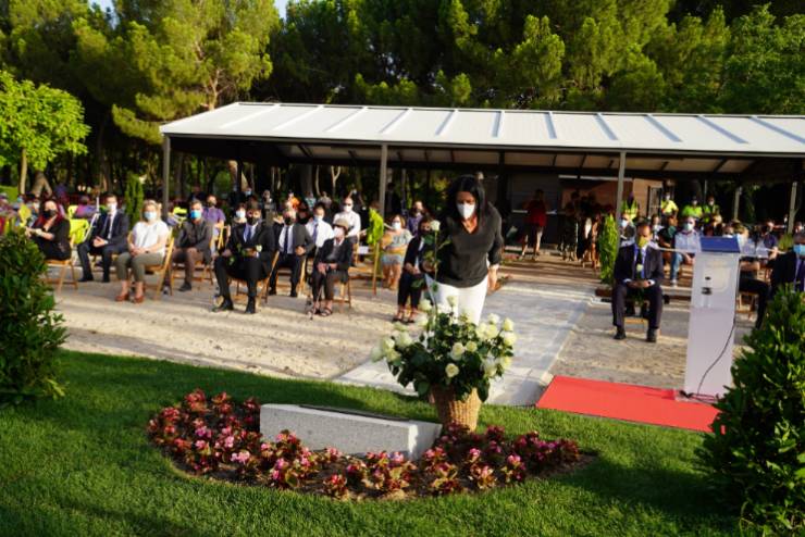 Imagen en alta resolución. Este enlace se abrirá mediante lightbox, puede haber un cambio de contextoEnvuelto en un solemne silencio, al abrigo de los árboles de la Finca Liana, Móstoles ha recordado en un sentido homenaje a todas las víctimas de la COVID-19. Personas con nombres y apellidos que han visto sus vidas segadas por la emergencia sanitaria, mientras sus familias, obligadas por estrictas medidas de seguridad, les decían adiós desde la distancia.
