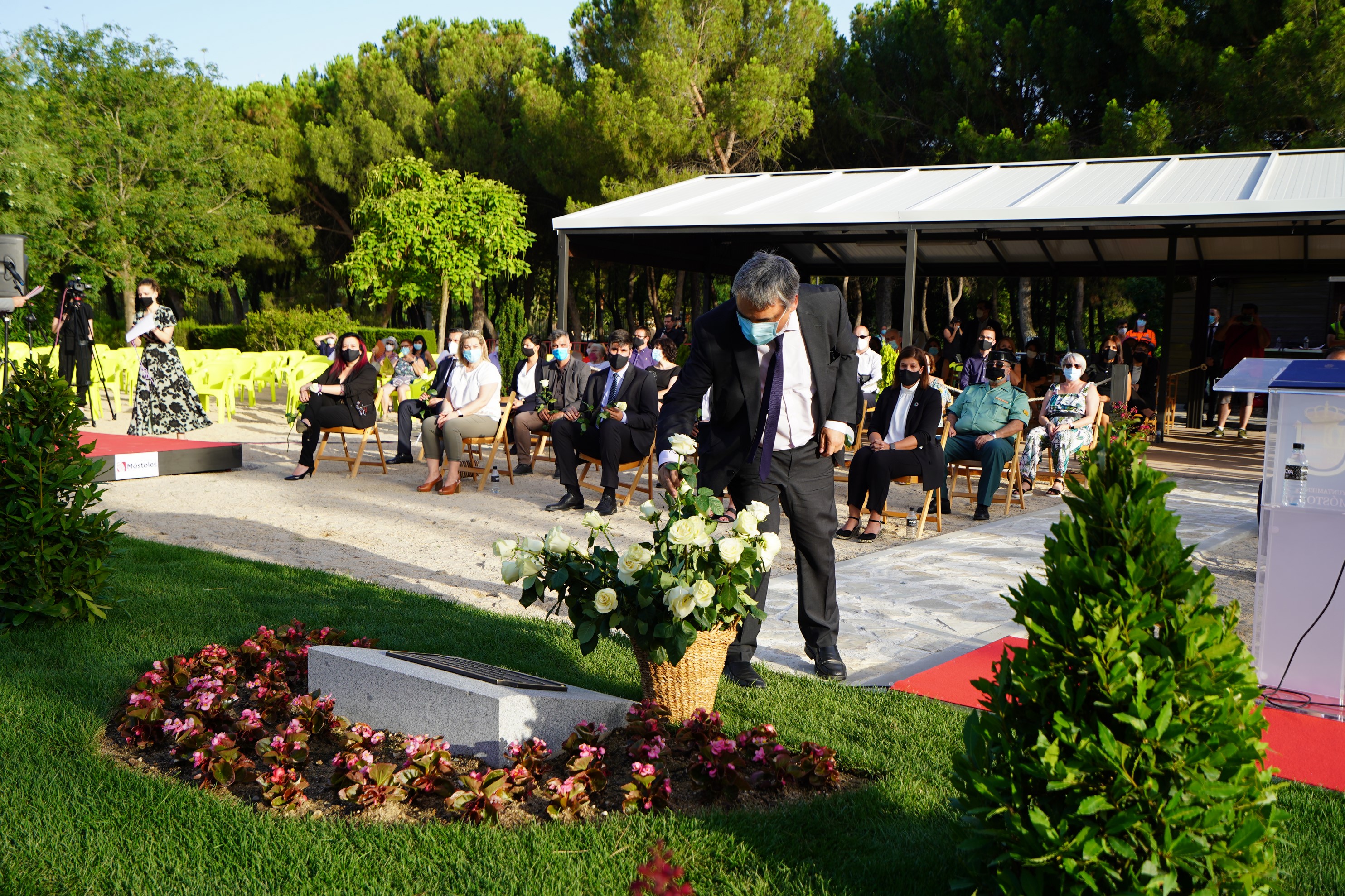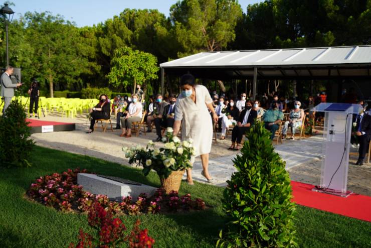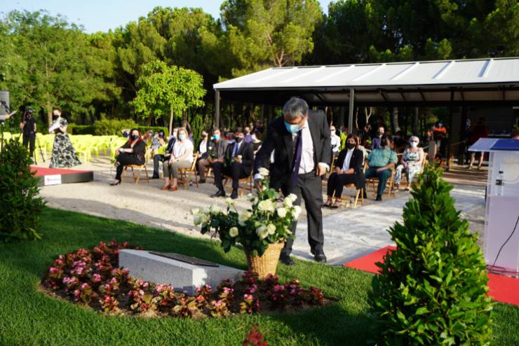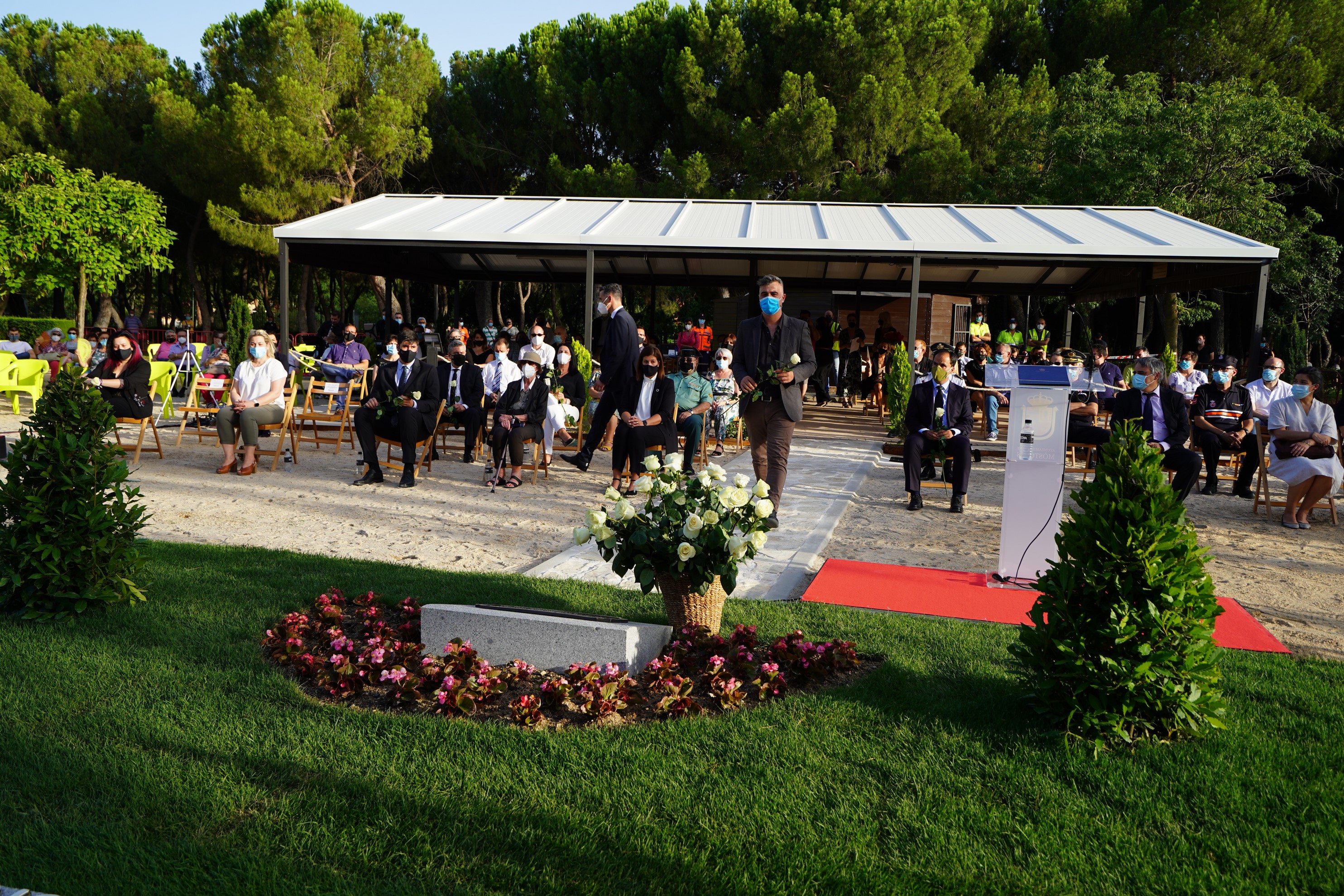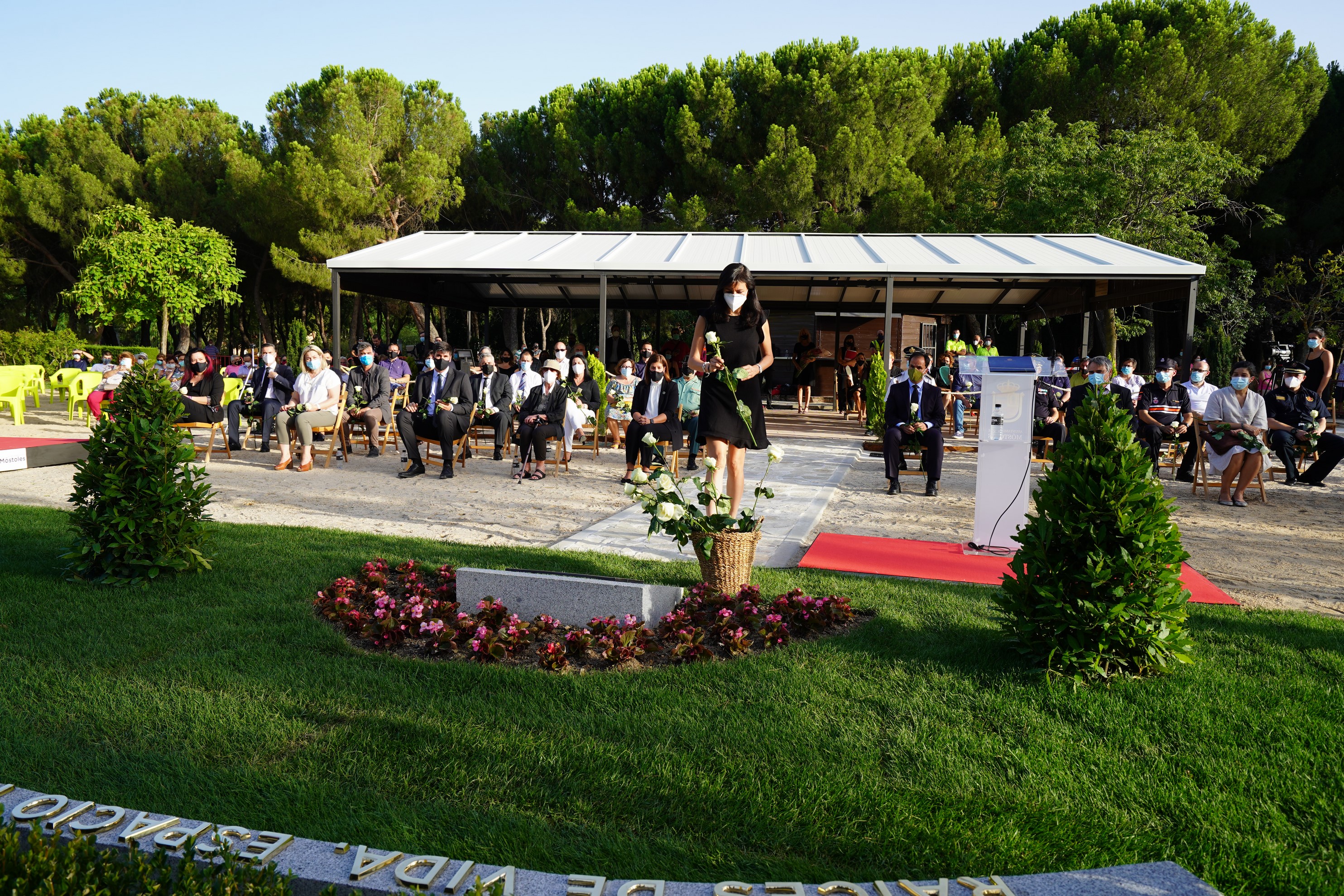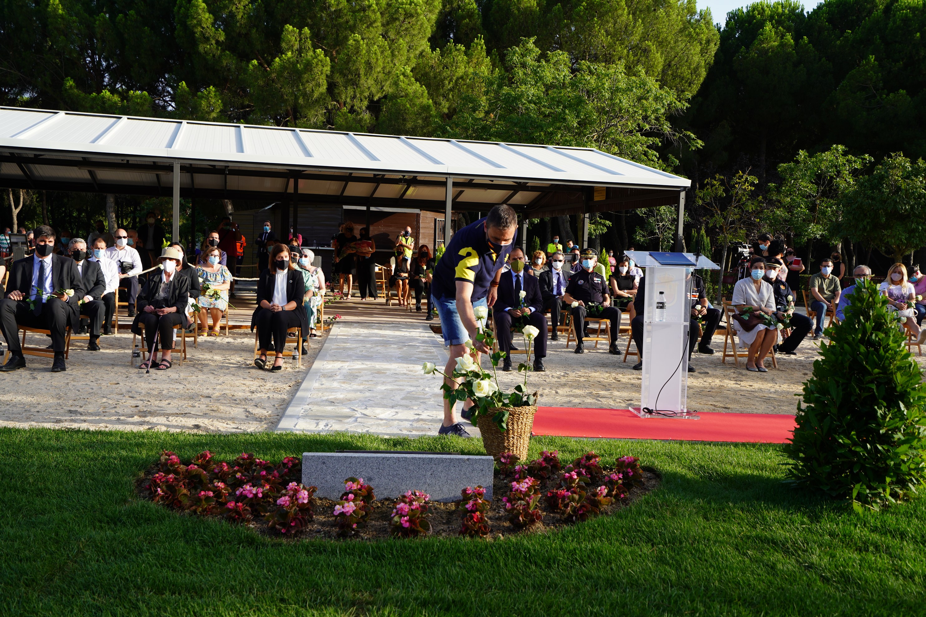 Imagen en alta resolución. Este enlace se abrirá mediante lightbox, puede haber un cambio de contextoEnvuelto en un solemne silencio, al abrigo de los árboles de la Finca Liana, Móstoles ha recordado en un sentido homenaje a todas las víctimas de la COVID-19. Personas con nombres y apellidos que han visto sus vidas segadas por la emergencia sanitaria, mientras sus familias, obligadas por estrictas medidas de seguridad, les decían adiós desde la distancia.