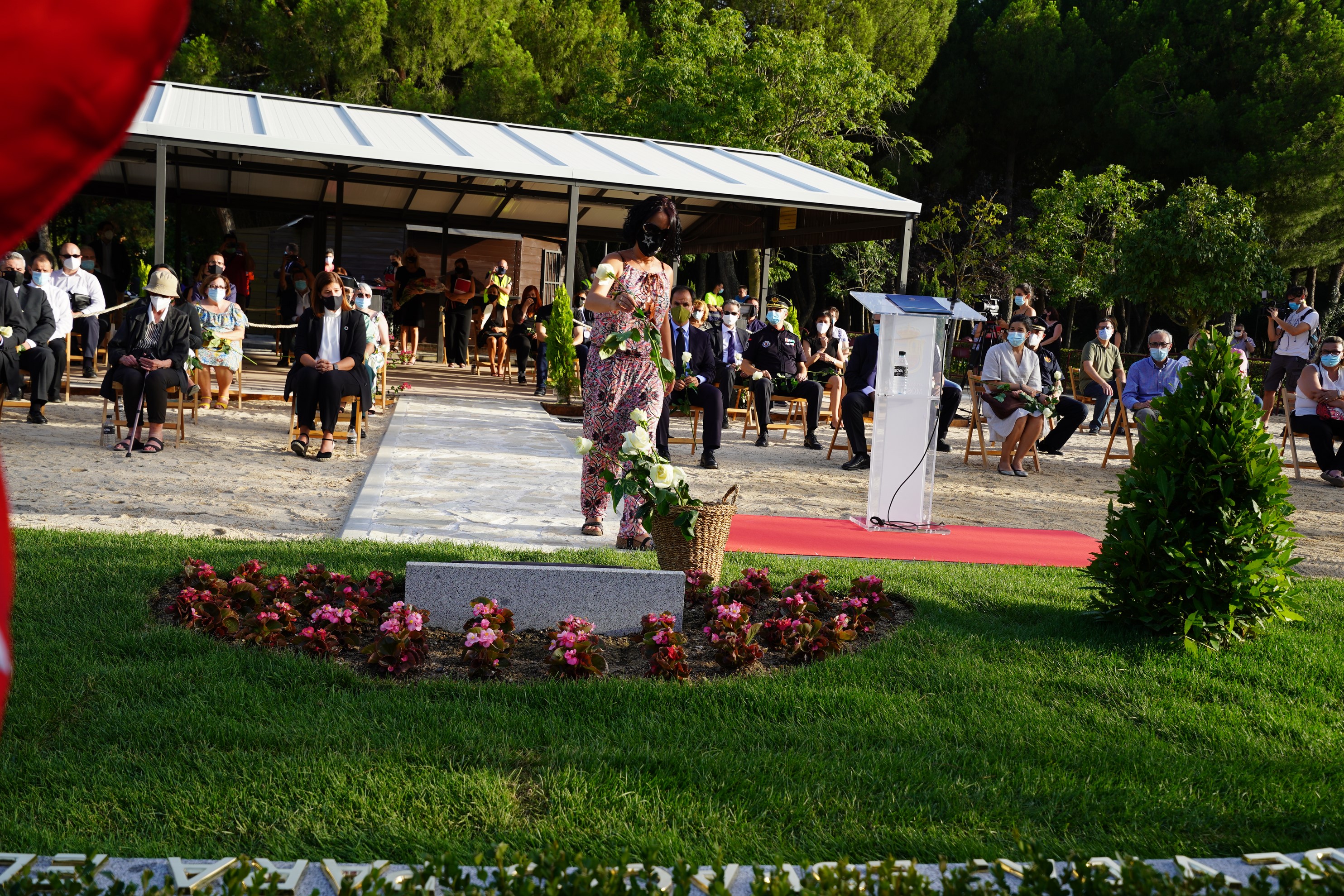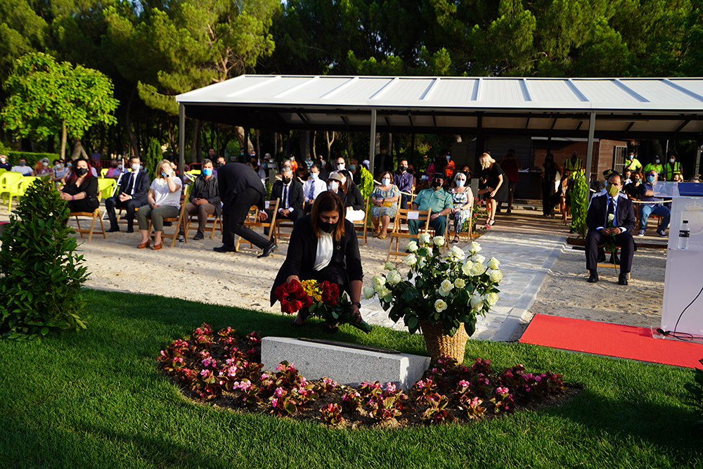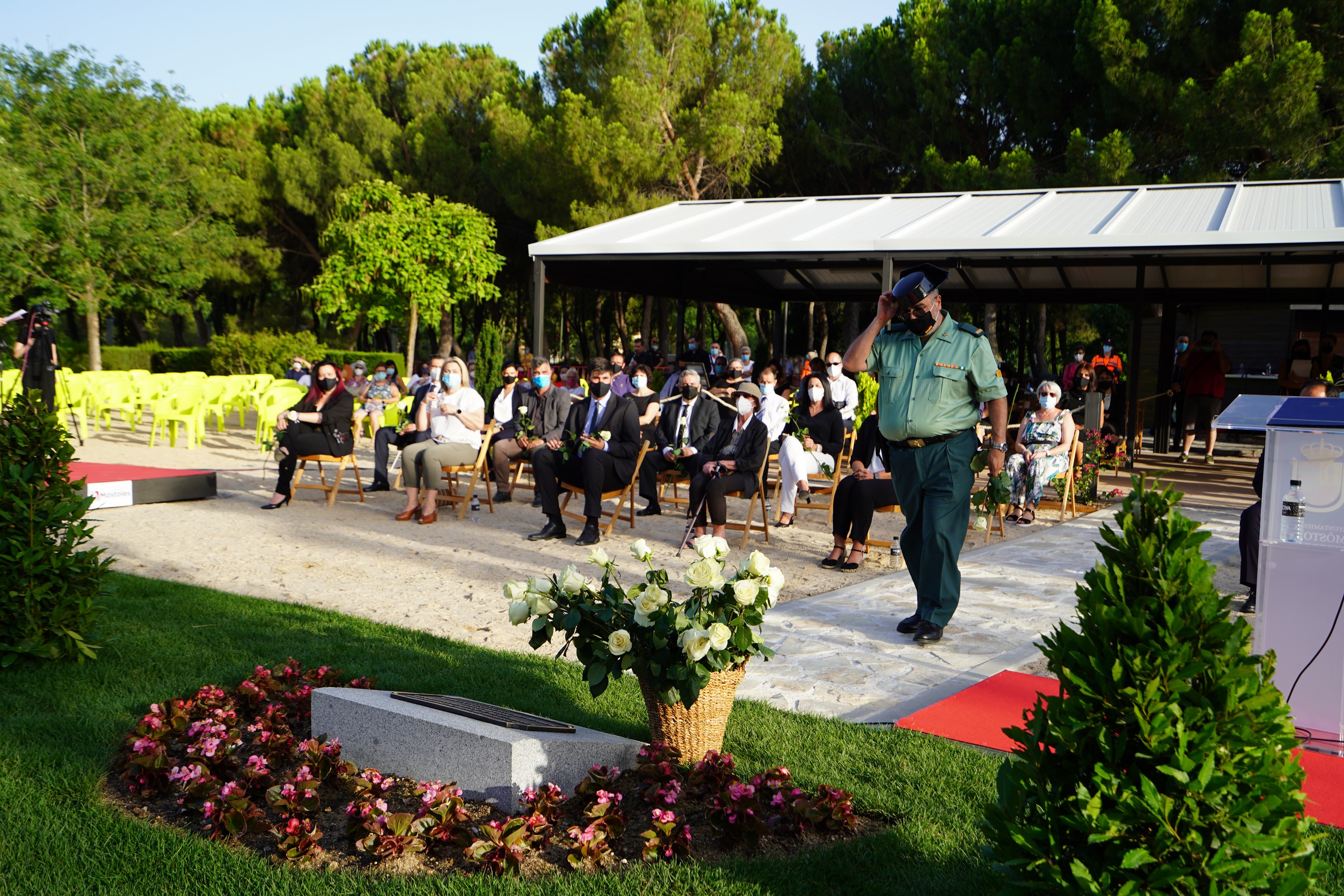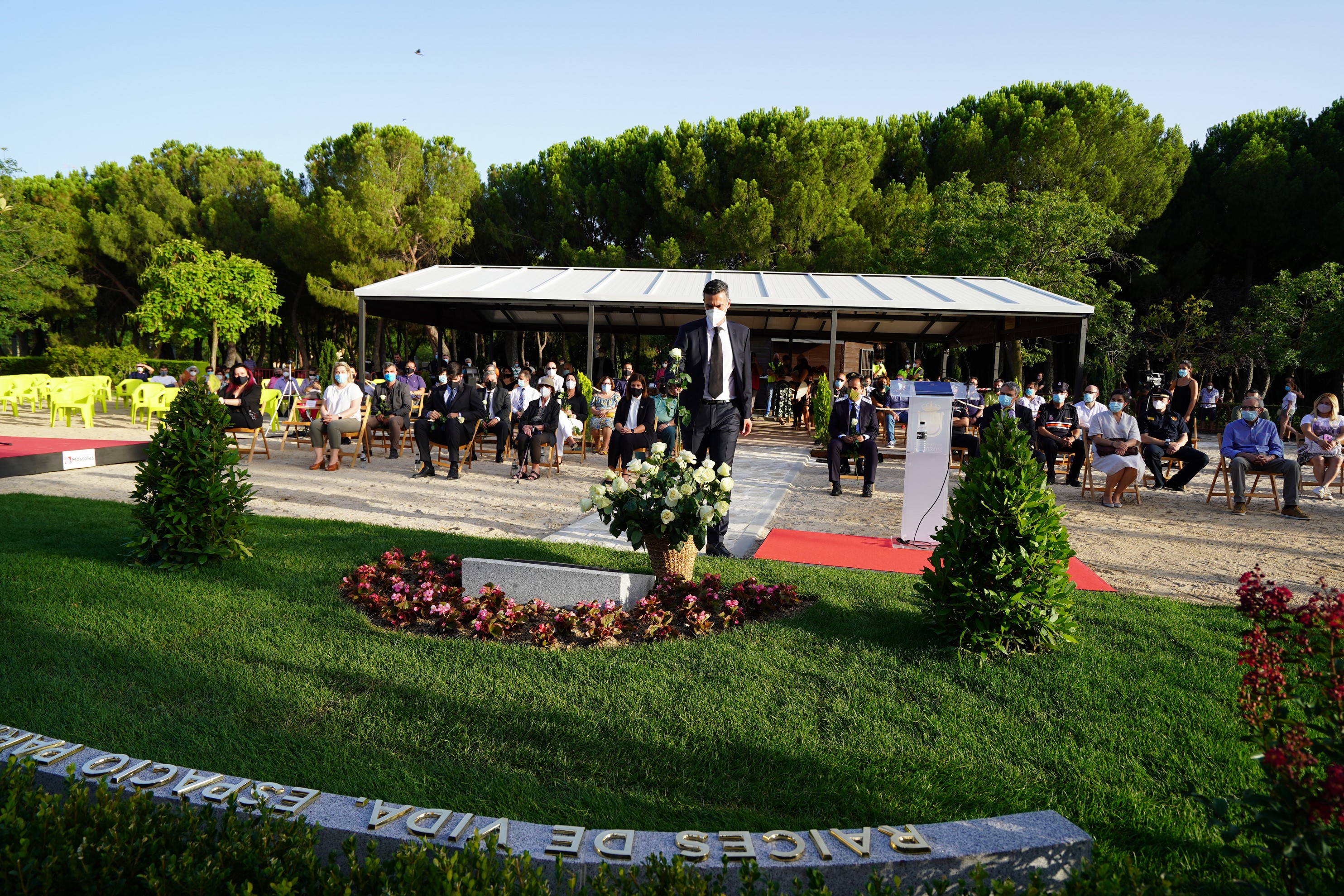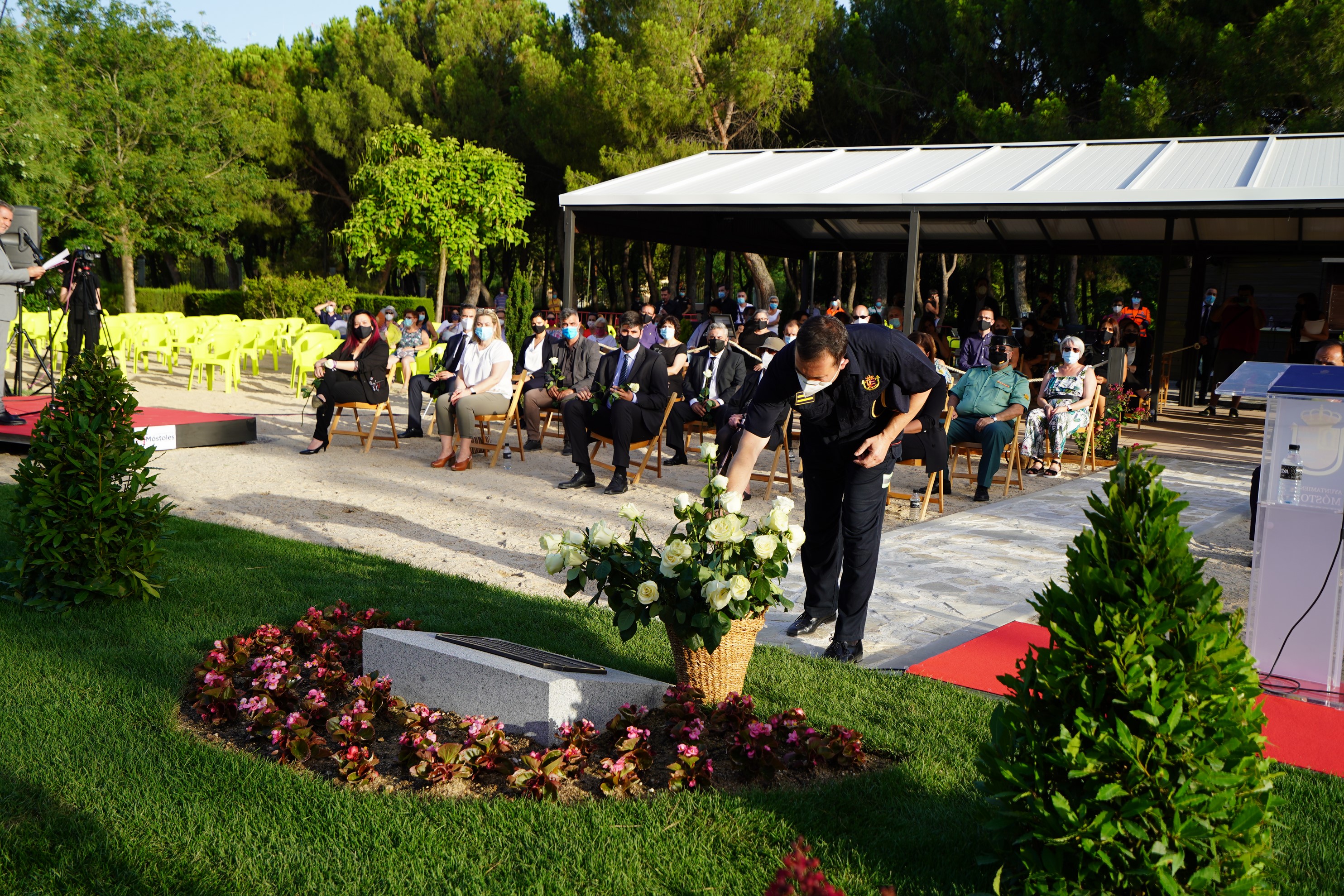 Imagen en alta resolución. Este enlace se abrirá mediante lightbox, puede haber un cambio de contextoEnvuelto en un solemne silencio, al abrigo de los árboles de la Finca Liana, Móstoles ha recordado en un sentido homenaje a todas las víctimas de la COVID-19. Personas con nombres y apellidos que han visto sus vidas segadas por la emergencia sanitaria, mientras sus familias, obligadas por estrictas medidas de seguridad, les decían adiós desde la distancia.