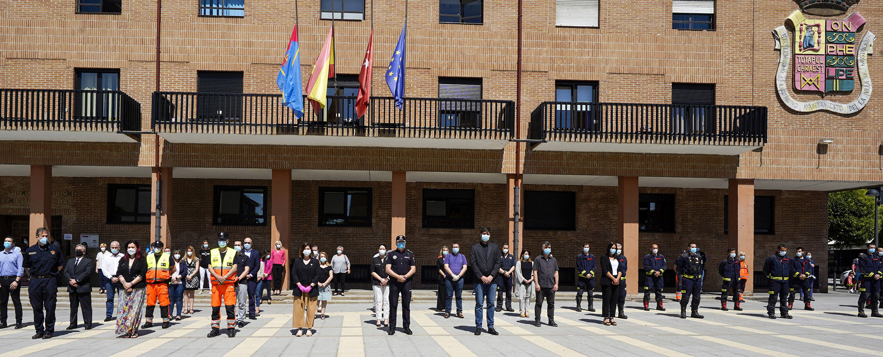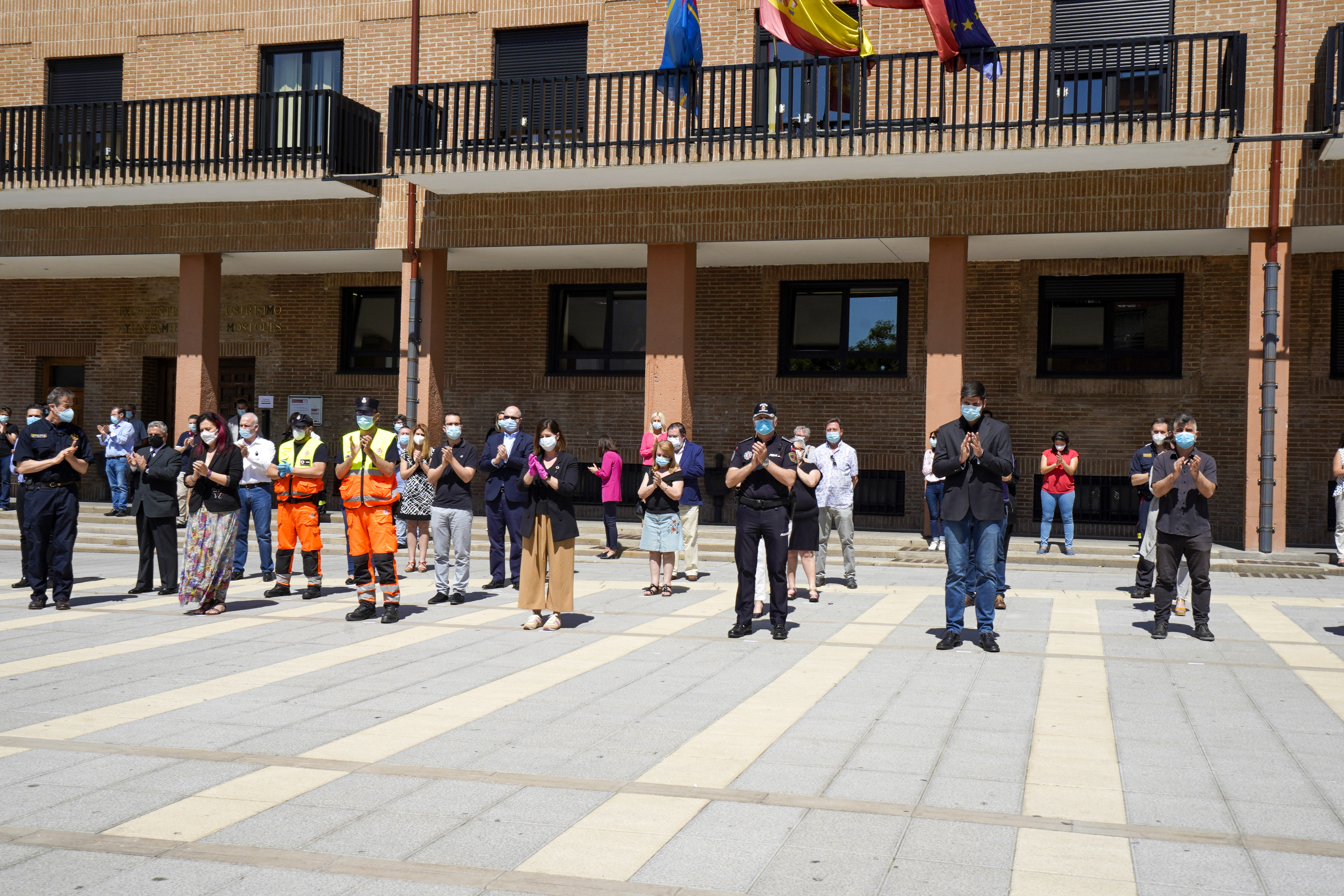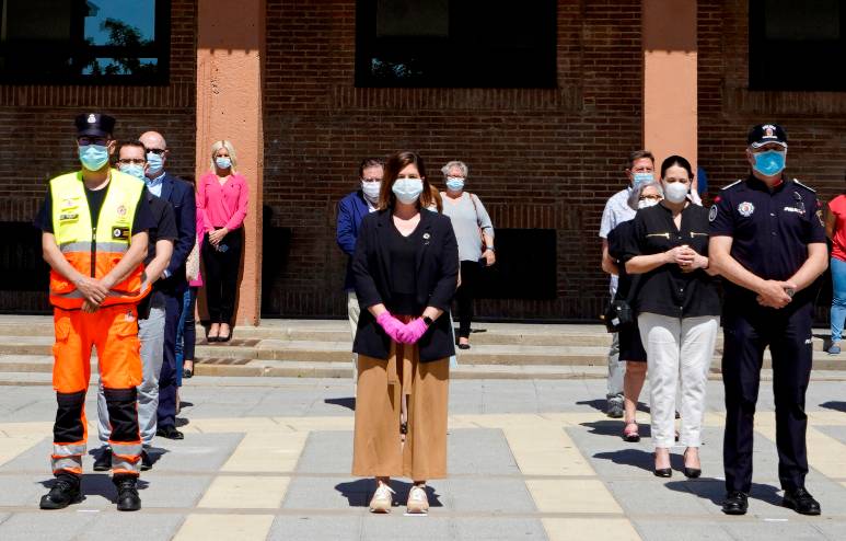 Las Autoridades, acompañadas de representantes de Policía Municipal, Bomberos, Protección Civil y de otros trabajadores de servicios públicos esenciales y vecinos de la ciudad, han guardado un minuto de silencio en honor a todos los fallecidos por el coronavirus.