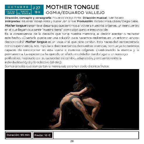 "Mother Tongue" transmite a través de la danza el desarraigo que sentimos al volver a nuestros orígenes, un reencuentro en el que llegamos a sentir "nuestra tierra" como algo ajeno e irreconocible. Es la consecuencia de la decisión que toma nuestra memoria, al decidir aceptar o rechazar este hecho. Interpretan la obra Eduardo Vallejo y Nabar Jon Ander.