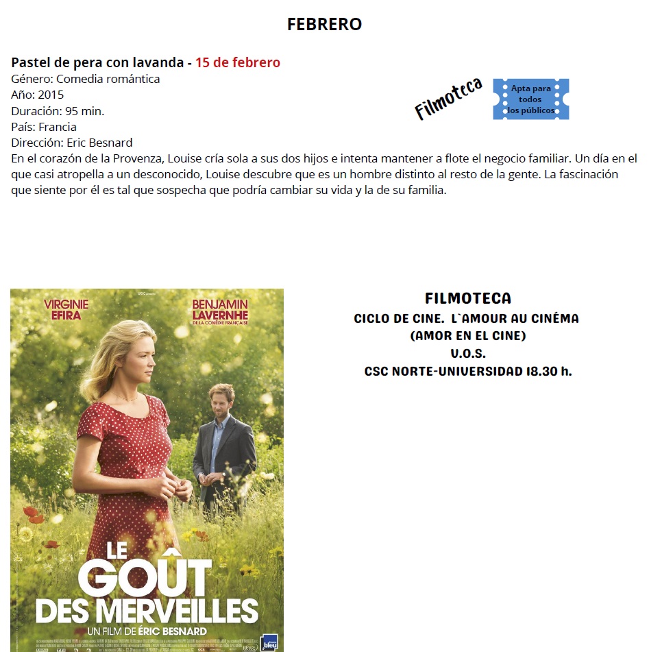 El programa "Filmoteca" continúa esta semana con el ciclo "L’amour au Cinema (Amor en el Cine)", dedicado a la comedia francesa. En esta ocasión, se proyectará "Pastel de pera con lavanda" en el Centro Sociocultural Norte-Universidad, el miércoles 15 a las 18:30 h.