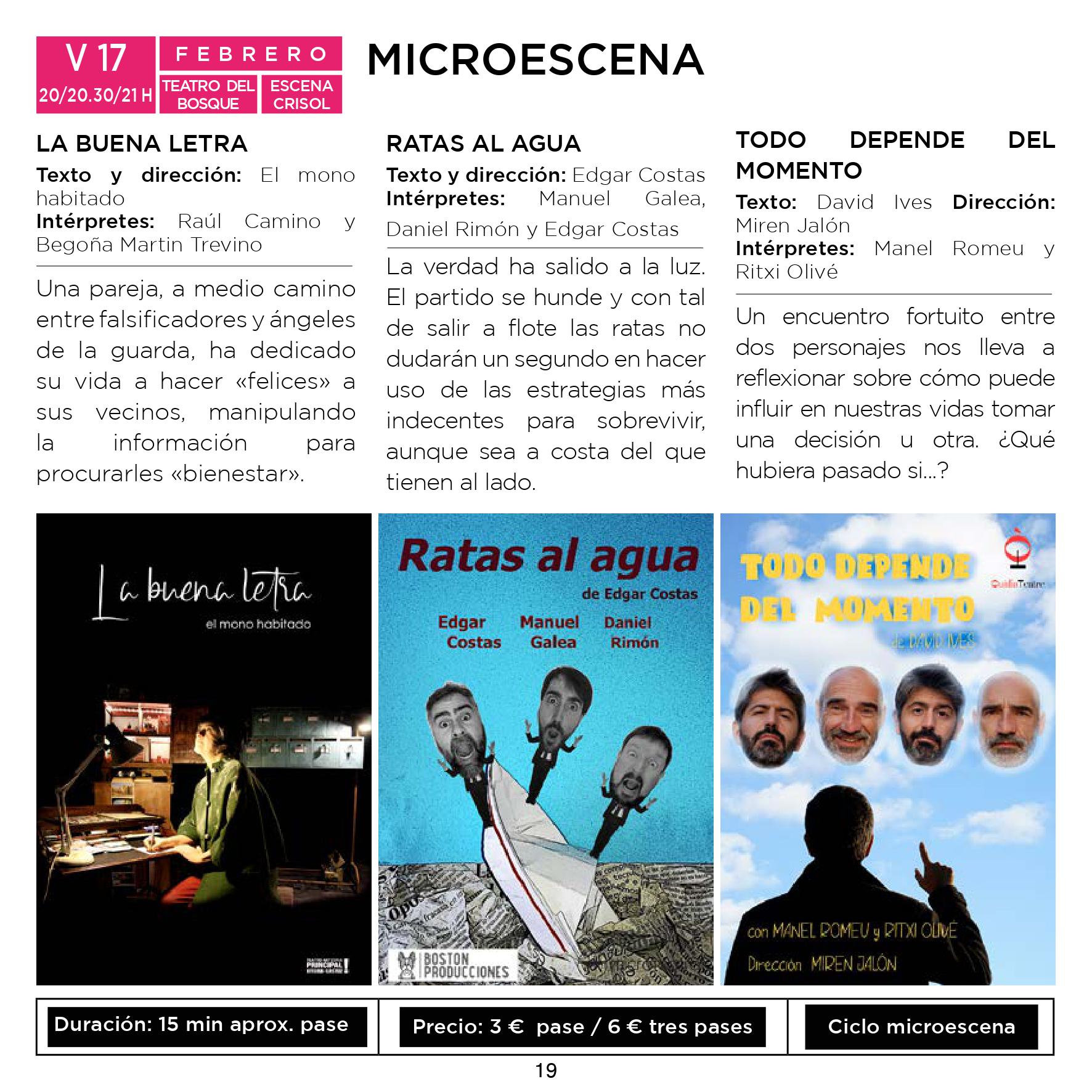 Esta semana Escena Crisol, que da cabida a creadoras y creadores jóvenes de cualquier rama de las artes escénicas apostando por la investigación y la innovación, vuelve al Teatro del Bosque el viernes 17, a las 20:00 h, 20:30 h y 21:00 h con las obras de microteatro "La buena letra", "Ratas al agua" y "Todo depende del momento", de unos 15 minutos de duración cada una.