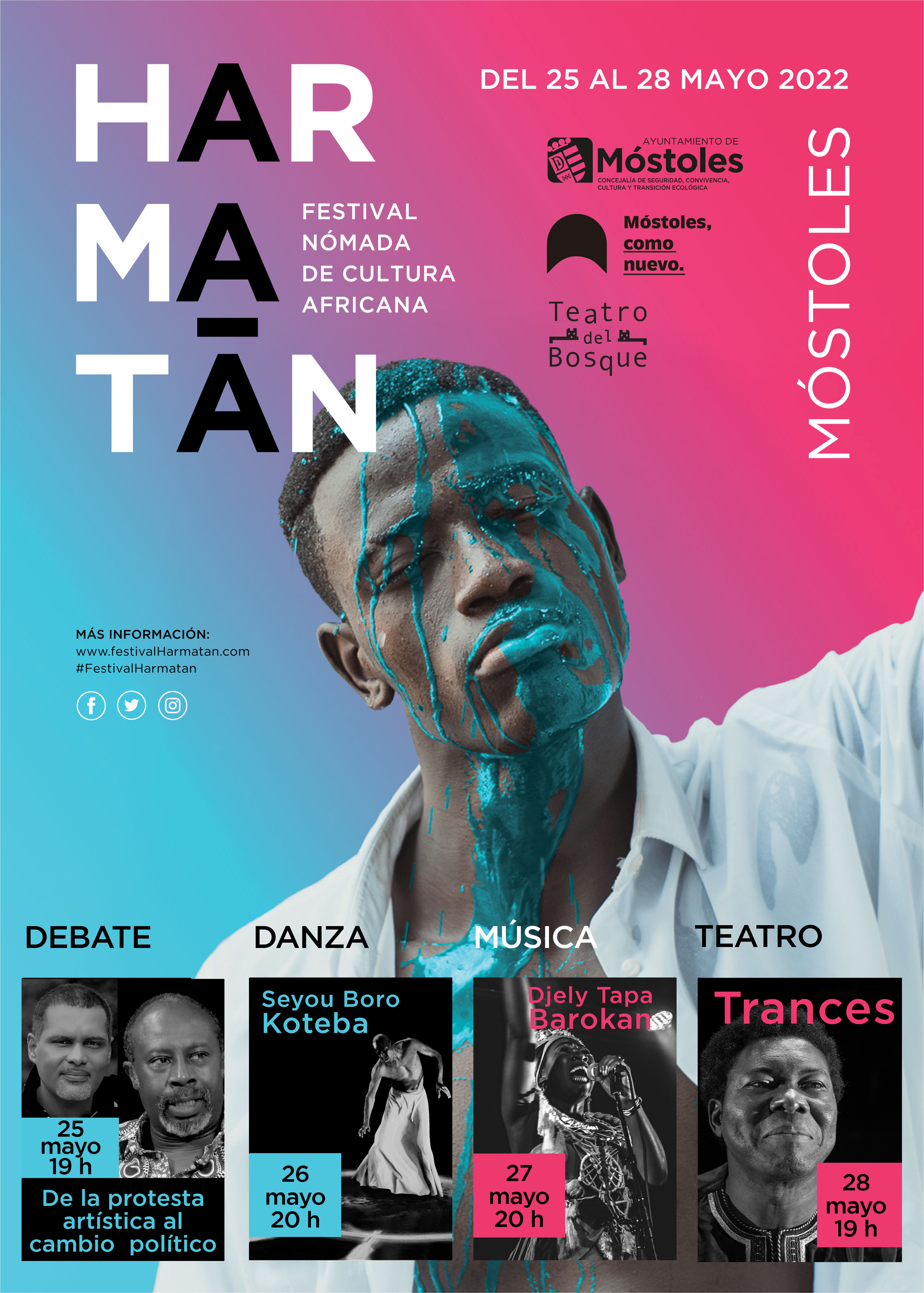 La agenda cultural de la semana, organizada por la Concejalía de Seguridad, Convivencia, Cultura y Transición Ecológica, tiene como evento más destacado el Festival Nómada de Cultura Africana Harmatán, cuya segunda edición tendrá lugar en el Teatro del Bosque, del 25 al 28 de mayo con espectáculos de danza, música y teatro. Además, ofrecerá una nueva exposición, cine, un concierto de música clásica, y las habituales visitas guiadas al Museo de la Ciudad, Casa Museo Andrés Torrejón y al casco antiguo de Móstoles.