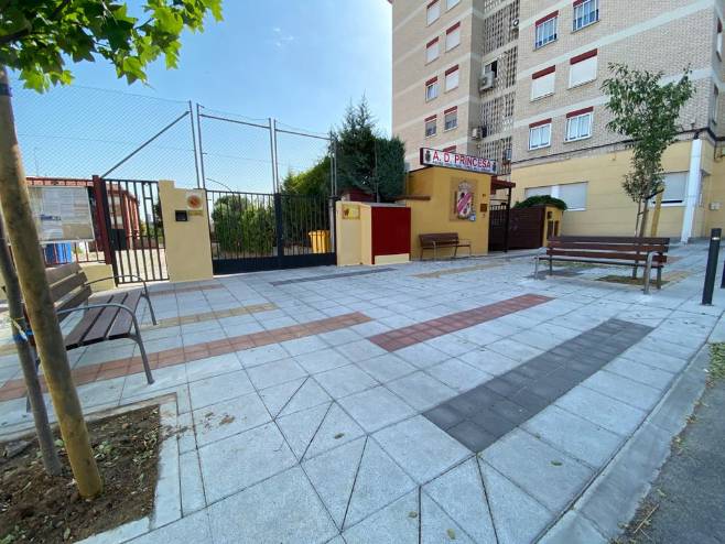 Además, de acuerdo con el plan de accesibilidad universal de Móstoles, se están instalando en el acceso a cada portal rampas y eliminando los escalones que limitaban el acceso a las personas con movilidad reducida. El solado se ha realizado con pavimento de gran calidad, intercalando baldosas de colores acordes con el entorno en el que se ha instalado.