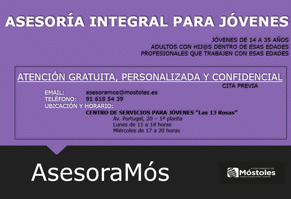 La atención en "AsesoraMós" se prestará presencialmente, de manera personalizada, confidencial y gratuita, mediante cita previa a través del teléfono 91 618 54 39 o de la dirección de correo electrónico, asesoramos@mostoles.esEste enlace se abrirá en una ventana nueva. El horario de atención al público es de 11 a 14 horas, los lunes, y de 17 a 20 horas, los miércoles, en el Centro de Servicios para Jóvenes "Las 13 Rosas" situado en Av. Portugal, 20.