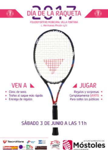 Dia de la raqueta 2017Imagen en alta resolución. Este enlace se abrirá mediante lightbox, puede haber un cambio de contextoDia de la raqueta 2017Mañana sábado, 3 de junio, se celebra en el Polideportivo Municipal Villafontana el "Día de la Raqueta". Desde las 11,00 horas se sucederá una jornada completa, con entrada gratuita, dedicada al mundo del tenis. Habrá monitores, clinics, premios al saque más rápido, regalos y sorpresas, entre otras actividades. Un día de diversión para disfrutar los pequeños y los mayores. Organiza la Concejalía de Deportes, colabora entre otros, la Federación Madrileña de Tenis.