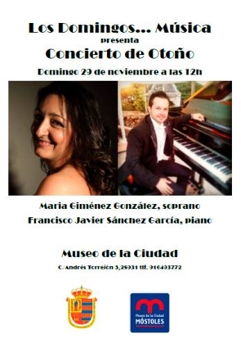 Imagen en alta resolución. Este enlace se abrirá mediante lightbox, puede haber un cambio de contextoLa concejalía de Cultura, Festejos y Deportes presentará, el domingo 29 de noviembre a las 12h. dentro de la programación "Los Domingos…Música" del Museo de la Ciudad, un recital en el que se interpretarán tanto piezas de canción española, lied, ópera y zarzuela, pasando desde compositores como Mozart, Haendel, Schumann, Schubert, Falla, Lorca ..., a cargo de la soprano María Giménez y al pianista Francisco Javier Sánchez. Las entradas se podrán retirar a partir del martes 24 de noviembre, en el horario habitual del Museo de la Ciudad.
