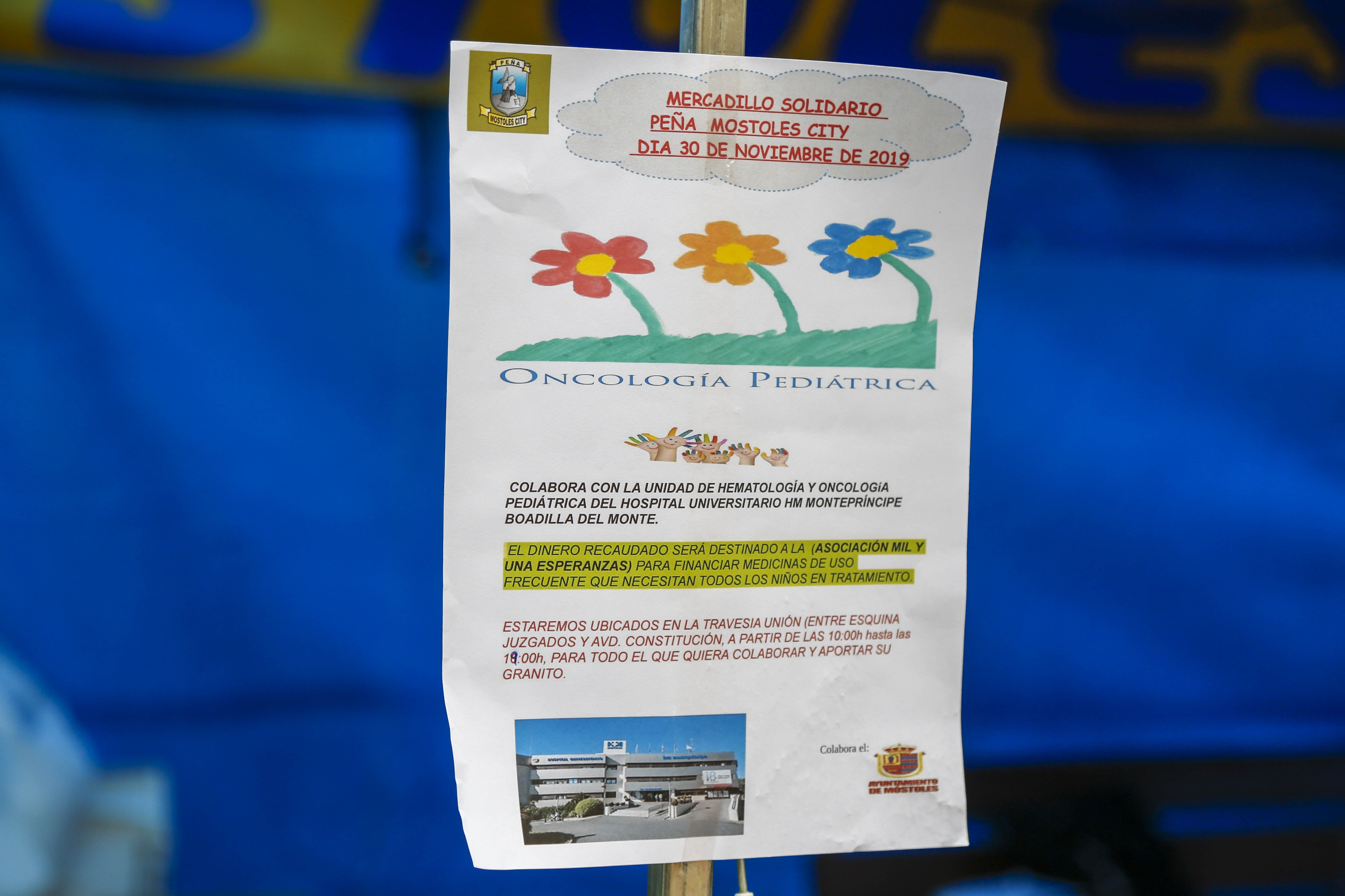 Imagen en alta resolución. Este enlace se abrirá mediante lightbox, puede haber un cambio de contextoCon el eslogan "Ven con nosotros, tu aportación lo agradecen nuestros peques de oncología", la Peña Móstoles City organizó, en colaboración con el Ayuntamiento de Móstoles, un mercadillo solidario a favor de la "Asociación mil y una esperanzas". La iniciativa ha sido la de recaudar fondos para destinarlos a la financiación de medicinas de uso frecuente que necesitan todos los niños en tratamiento.