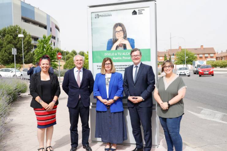 La Alcaldesa, Noelia Posse, acompañada de la Concejala de Presidencia y Desarrollo Urbano, Marisa Ruiz, el Consejero Delegado de JCDecaux, Alexandre Roubaud, y el Director General de JCDecaux, Carlos Barón, y la Portavoz de Podemos, Mónica Monterreal, han presentado esta mañana el formato de los nuevos elementos de Mobiliario Urbano como Punto de Información (MUPI) digitales que se están distribuyendo por diferentes lugares de Móstoles dentro del plan de mejora de la comunicación exterior con el ciudadano.
