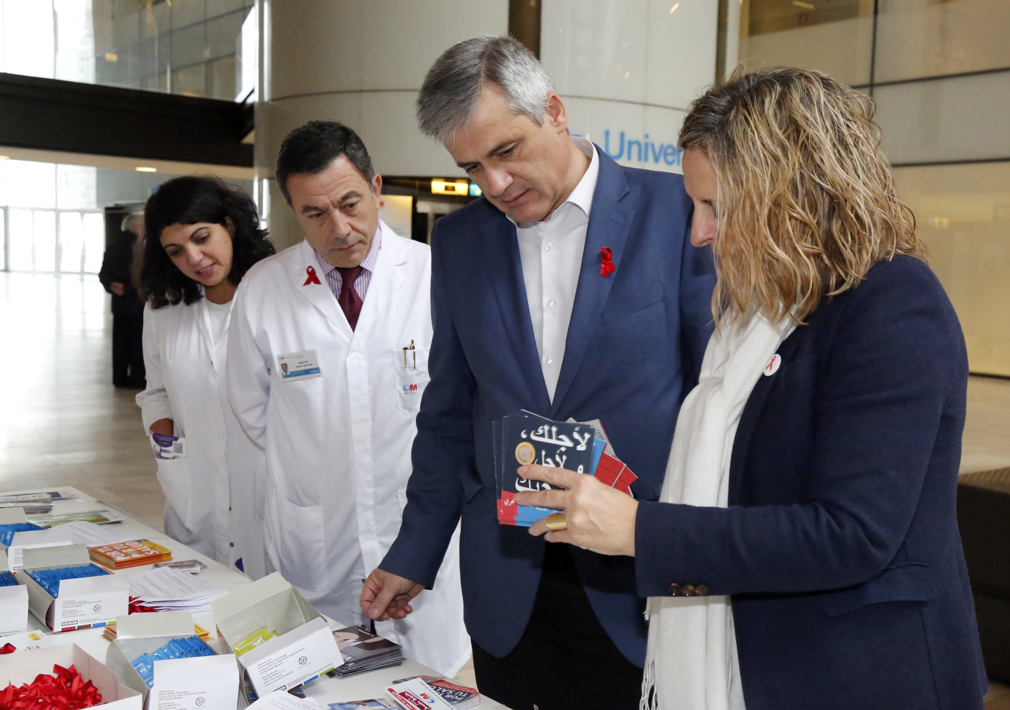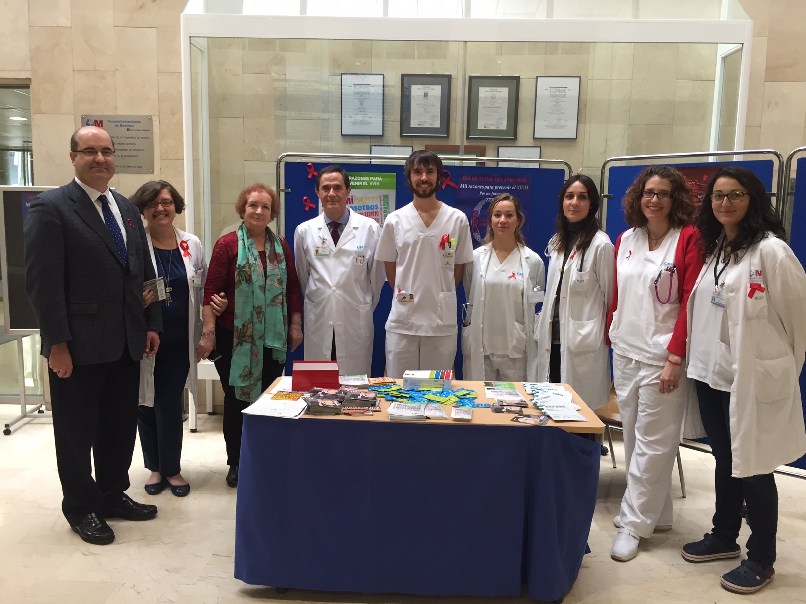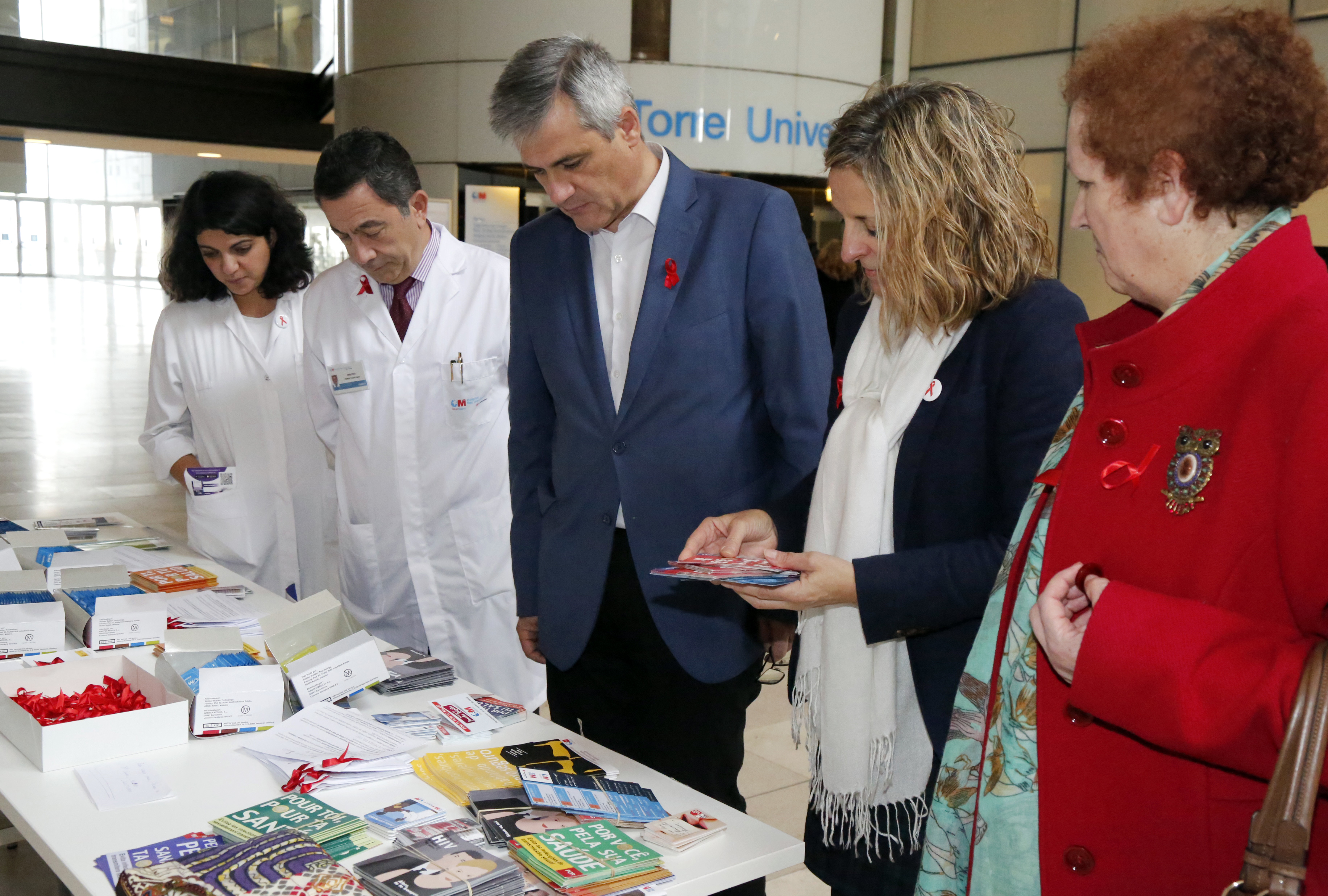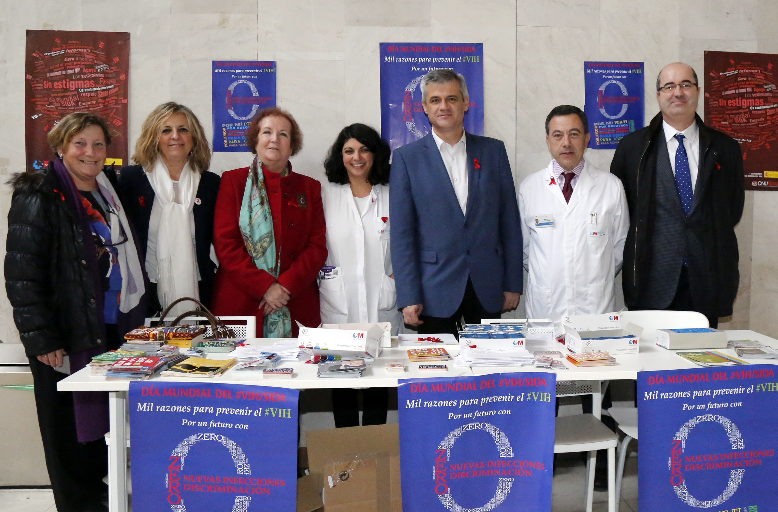 El alcalde de Móstoles, David Lucas, junto la concejala de Igualdad, Sanidad y Mayores, Ana María Rodrígo, ha visitado la mesa informativa y punto de realización de la prueba rápida del VIH instalada en el Hospital Rey Juan Carlos. También se ha instalado una mesa informativa en el Hospital Universitario.