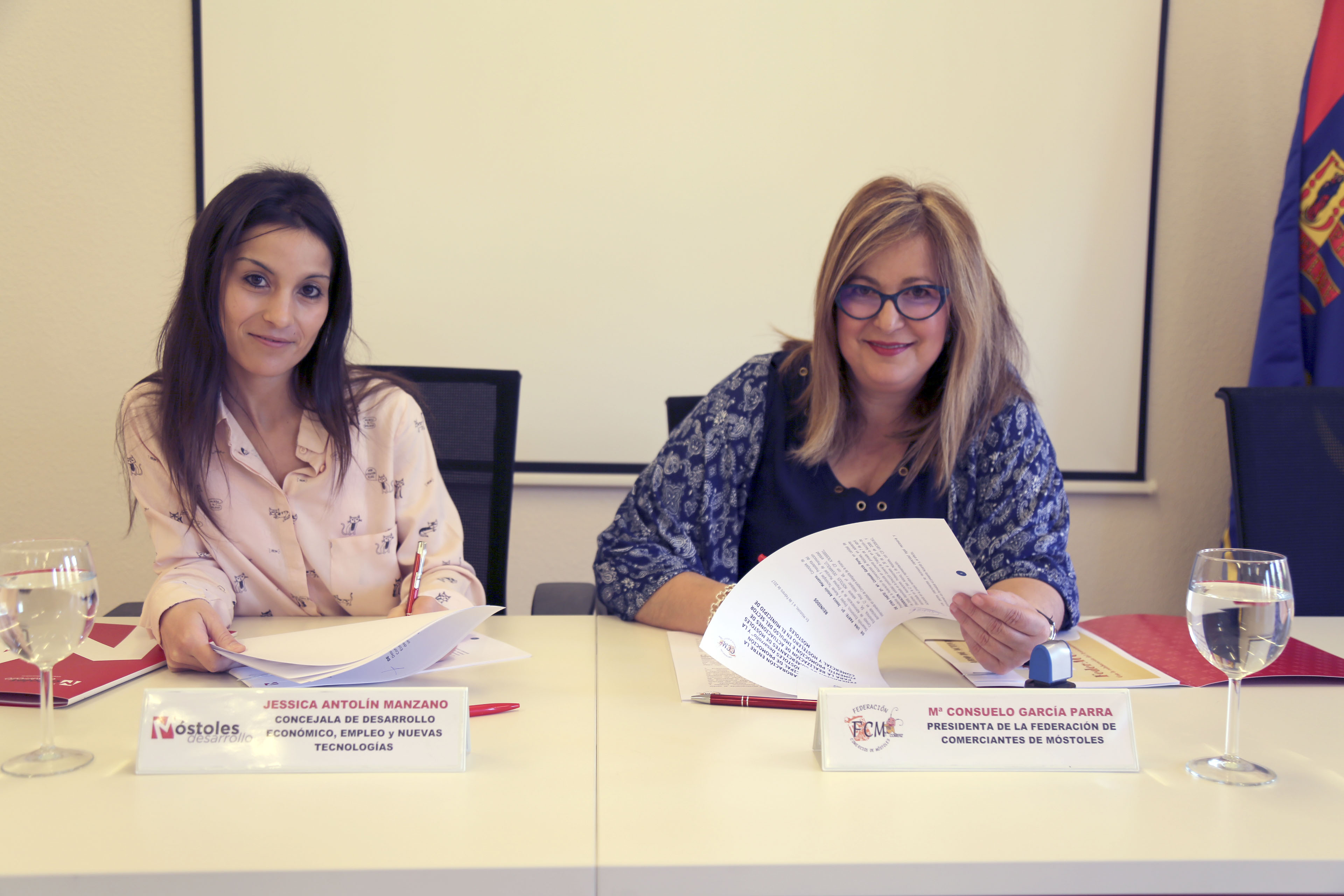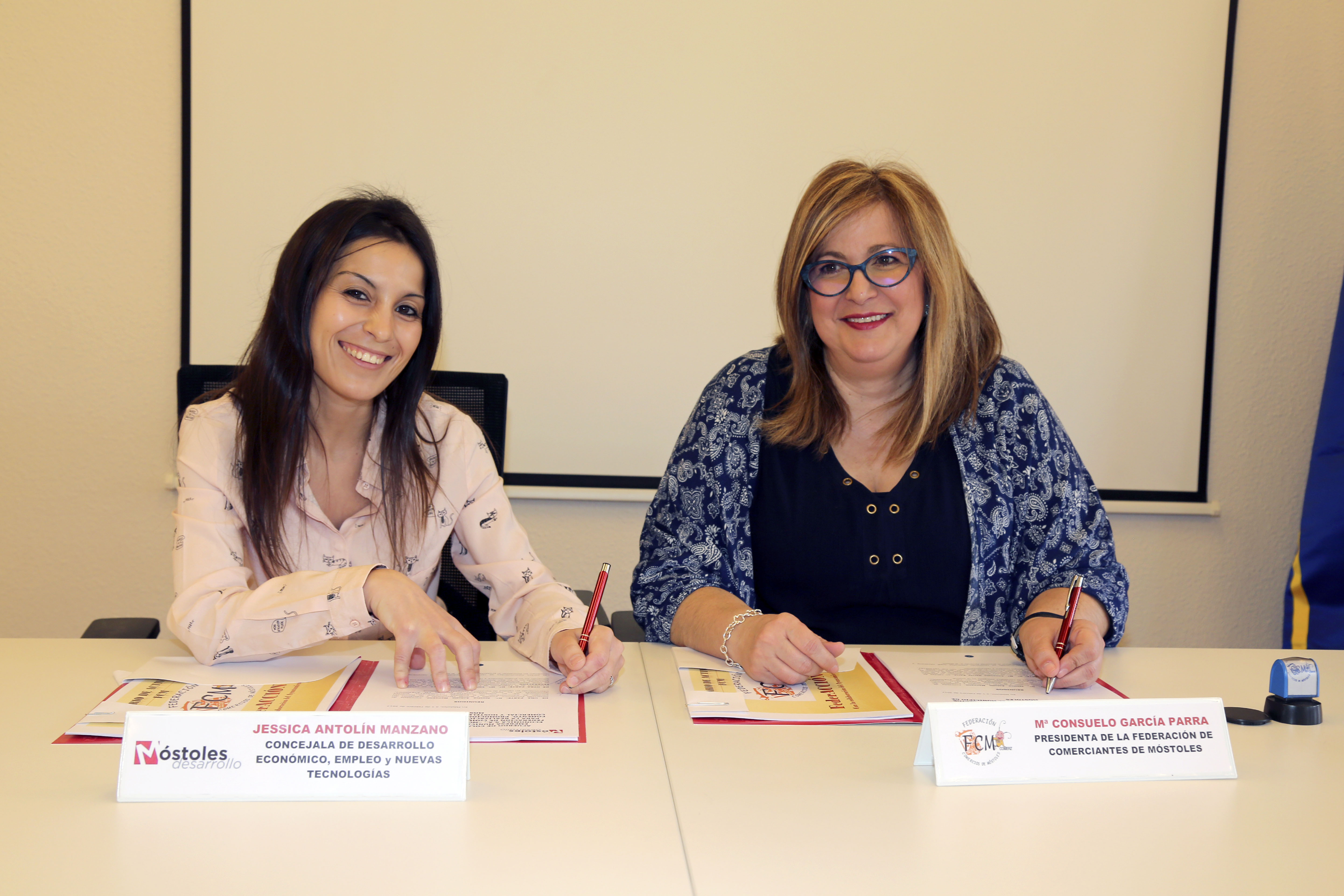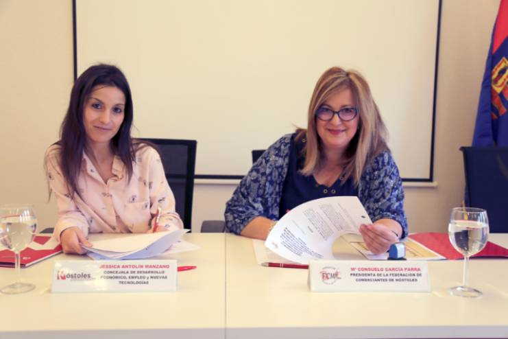 Imagen en alta resolución. Este enlace se abrirá mediante lightbox, puede haber un cambio de contextoLa concejala de Desarrollo Económico, Empleo y Nuevas Tecnologías, Jessica Antolín, y la presidenta de la Federación de Comerciantes de Móstoles, Chelo García, han firmado esta mañana un acuerdo de colaboración entre Móstoles Desarrollo y la Federación de Comerciantes de Móstoles. El acuerdo tiene por objetivo la realización de proyectos dirigidos a incrementar la competitividad y la oferta de un comercio y una hostelería urbana rentable y de calidad, a través de medidas que permitan mejorar las condiciones en las que se desenvuelve la actividad comercial, la gestión de los establecimientos y la cualificación del personal.