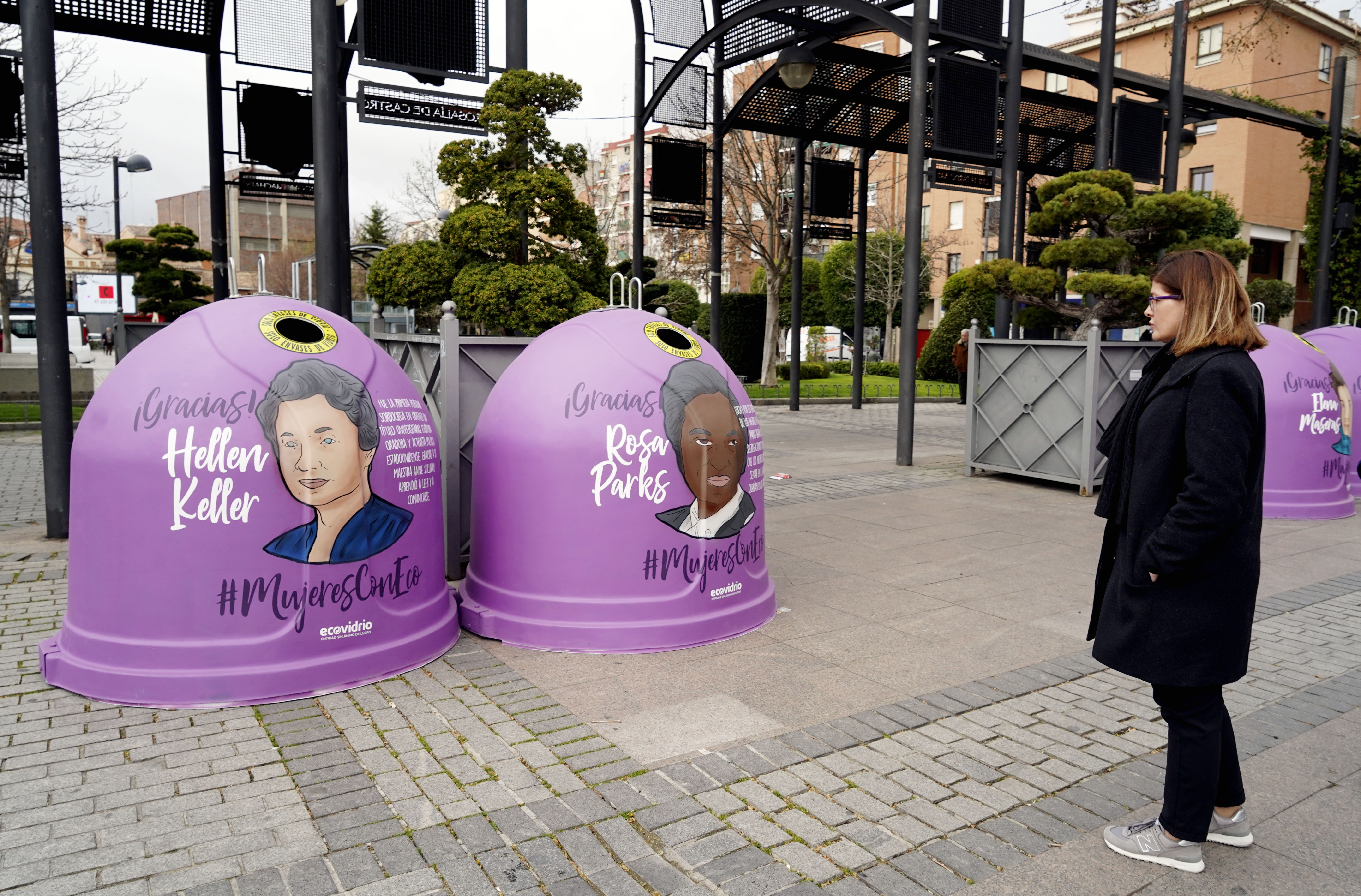 Durante las próximas semanas, contenedores morados tipo iglú pintados a mano mostrarán la imagen y una pequeña reseña de 15 mujeres que por distintas razones han dejado huella en la Historia. Se trata de mujeres como Manuela Malasaña (1791-1808), una heroína anónima que destacó durante la sublevación del 2 de Mayo; Elena Maseras (1853-1905) que fue la primera mujer en España que pudo matricularse en la Universidad sin tener que ir vestida de hombre; personalidades como Hellen Keller (1880-1968), primera persona sordociega en obtener un título universitario, o Rosa Parks (1913-2005) que destacó por su contribución a la lucha por los derechos civiles de los afroamericanos en Estados Unidos.