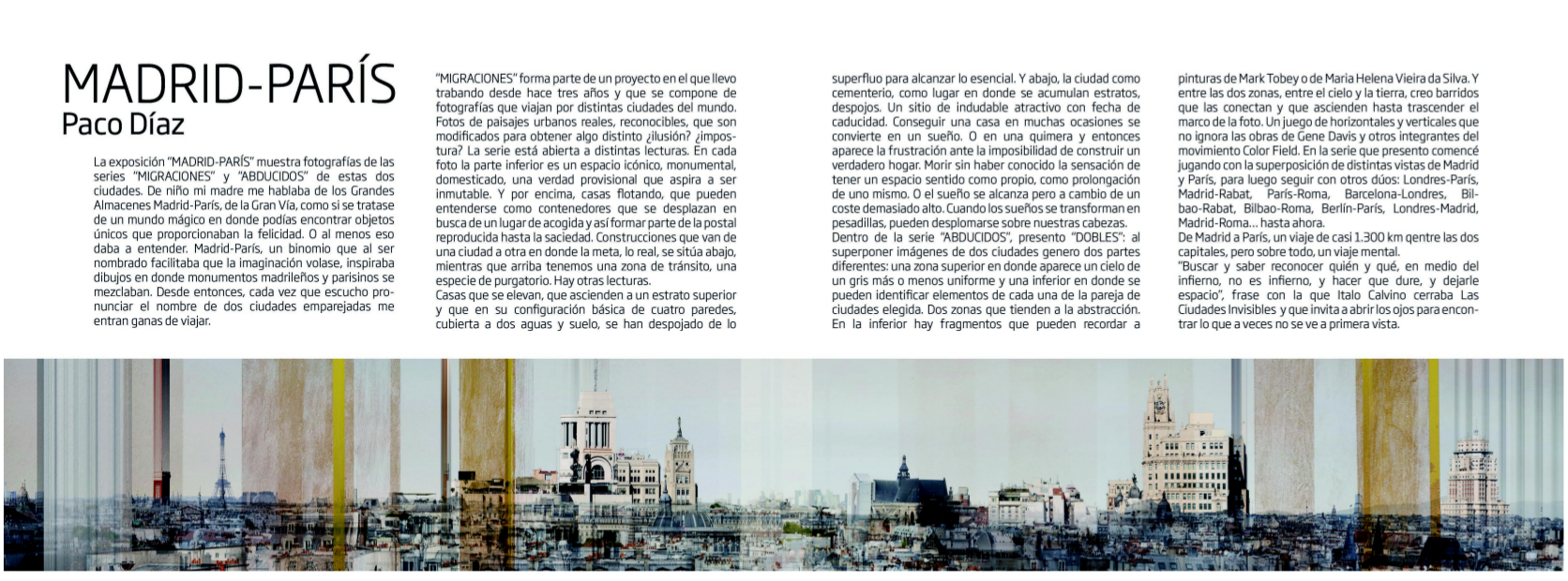 En la serie "Abducidos" realiza la superposición de imágenes de parejas de ciudades. En este caso Paco Díaz juega con la superposición de distintas vistas de Madrid y París. Se trata de un viaje en horizontal de casi 1.300 km entre las dos capitales, pero sobre todo es un viaje mental. De tal manera que surge una zona superior donde aparece un cielo gris más o menos uniforme y una inferior en la que se pueden identificar elementos de cada una de estas parejas de ciudades. Dos zonas que juntas tienden a la abstracción, en palabras del artista.