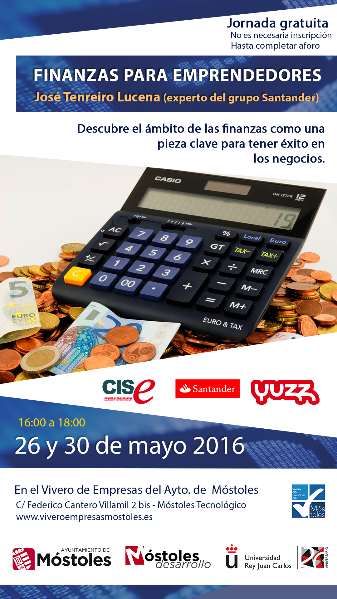 El Ayuntamiento de Móstoles, a través del Vivero de Empresas, organiza los próximos 26 y 30 de mayo de 16,00 a 18,00 horas la jornada "Finanzas para emprendedores", donde los asistentes podrán introducirse en el ámbito de las finanzas como una pieza clave para tener éxito en los negocios. La sesión será impartida por José Tenreiro Lucena, experto del grupo Santander.