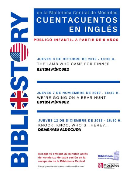 - Toda la programación se puede consultar en https://bibliotecademostoles.wordpress.com/2019/09/01/actividades-cuentacuentos-bibliostory-y-viernes-de-encuentro/