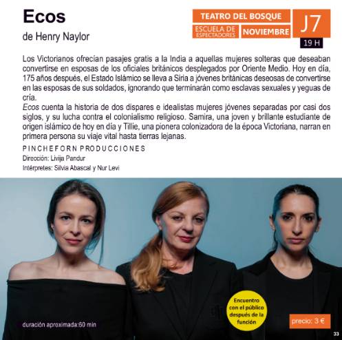 Imagen en alta resolución. Este enlace se abrirá mediante lightbox, puede haber un cambio de contextoDentro de la Escuela de Espectadores del programa teatral A Escena, este jueves 7 de noviembre a las 19 horas, se representará en el Teatro del Bosque la obra `Ecos´ de Henry Naylor. Está producida por la compañía Pincheform y son sus intérpretes Silvia Abascal y Nur Levi. La dirección corre a cargo de Livija Pandur.
