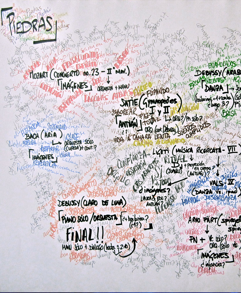 En palabras de sus creadores: «¿Qué es lo más importante para cada uno de nosotros? ¿qué necesitamos? ¿qué buscamos? o más bien: ¿qué esperamos de esta vida? Si pudiéramos elegir aquello indispensable, realmente importante, necesario e imprescindible con lo que asegurarnos una vida plena… ¿tendríamos claro qué elegir? Salud, dinero y amor… demasiado fácil, ¿no creéis? nos dejaríamos cosas como la amistad, el liderazgo, la educación, la familia, la religión, la cultura… una piedra. Una de tantas. Sólida, pero moldeable. Abrupta, pero preciosa en muchas ocasiones ―siempre menos de las deseadas―. Artificialmente usada para embellecer, pero constantemente transformada por el tiempo en pura armonía con su entorno. La piedra como elemento sustentador. La piedra como germen y final. La piedra como pilar indispensable que soporte nuestra existencia. Desgranando la superficie de esa piedra hasta encontrar el núcleo puro de nuestra razón de existir. Mozart, Ravel, Satie, Gorecki, Arvo Pärt, Bach, Ligeti… Por esto nace Piedras, y por mucho más…»