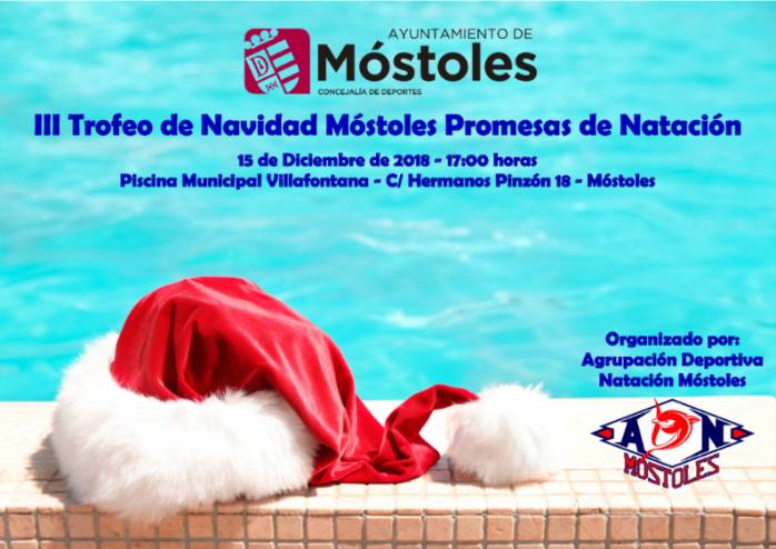 Cartel Trofeo Navidad 2018 AltaImagen en alta resolución. Este enlace se abrirá mediante lightbox, puede haber un cambio de contextoCartel Trofeo Navidad 2018 AltaEl próximo 15 de diciembre, a las 17:00 horas, en la Piscina Municipal de Villafontana el, se celebrará III Trofeo de Navidad Móstoles Promesas de Natación, organizado por la Agrupación Deportiva Natación Móstoles, con la colaboración de la Concejalía de Deportes del Ayuntamiento de Móstoles.